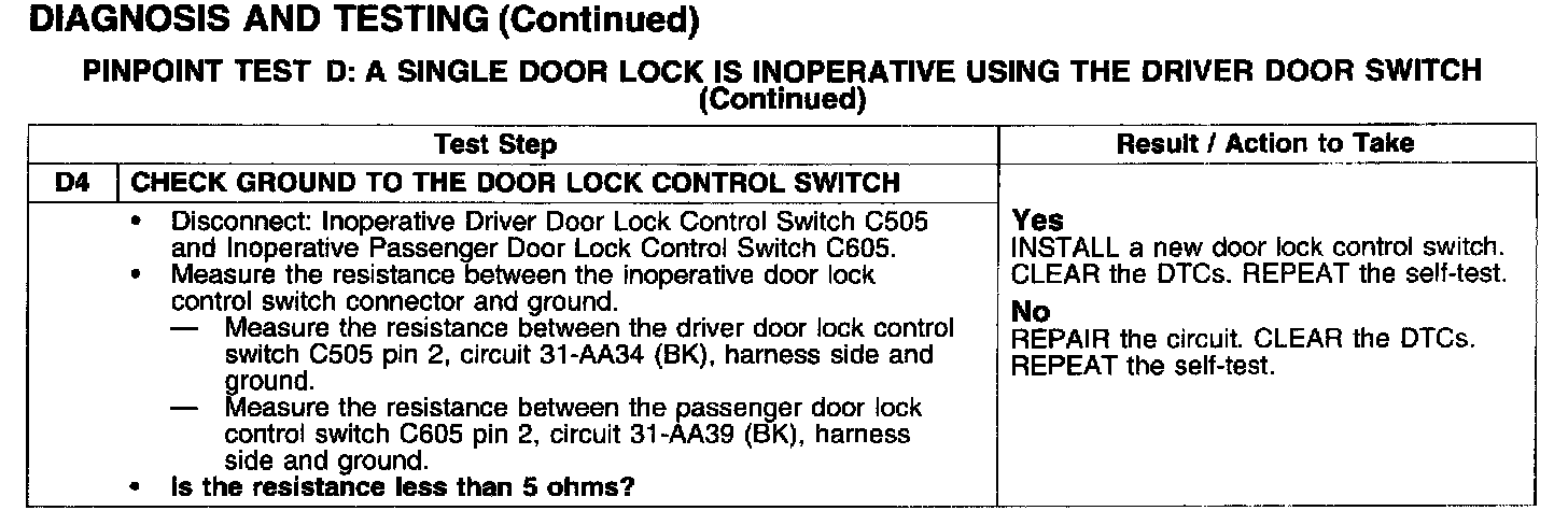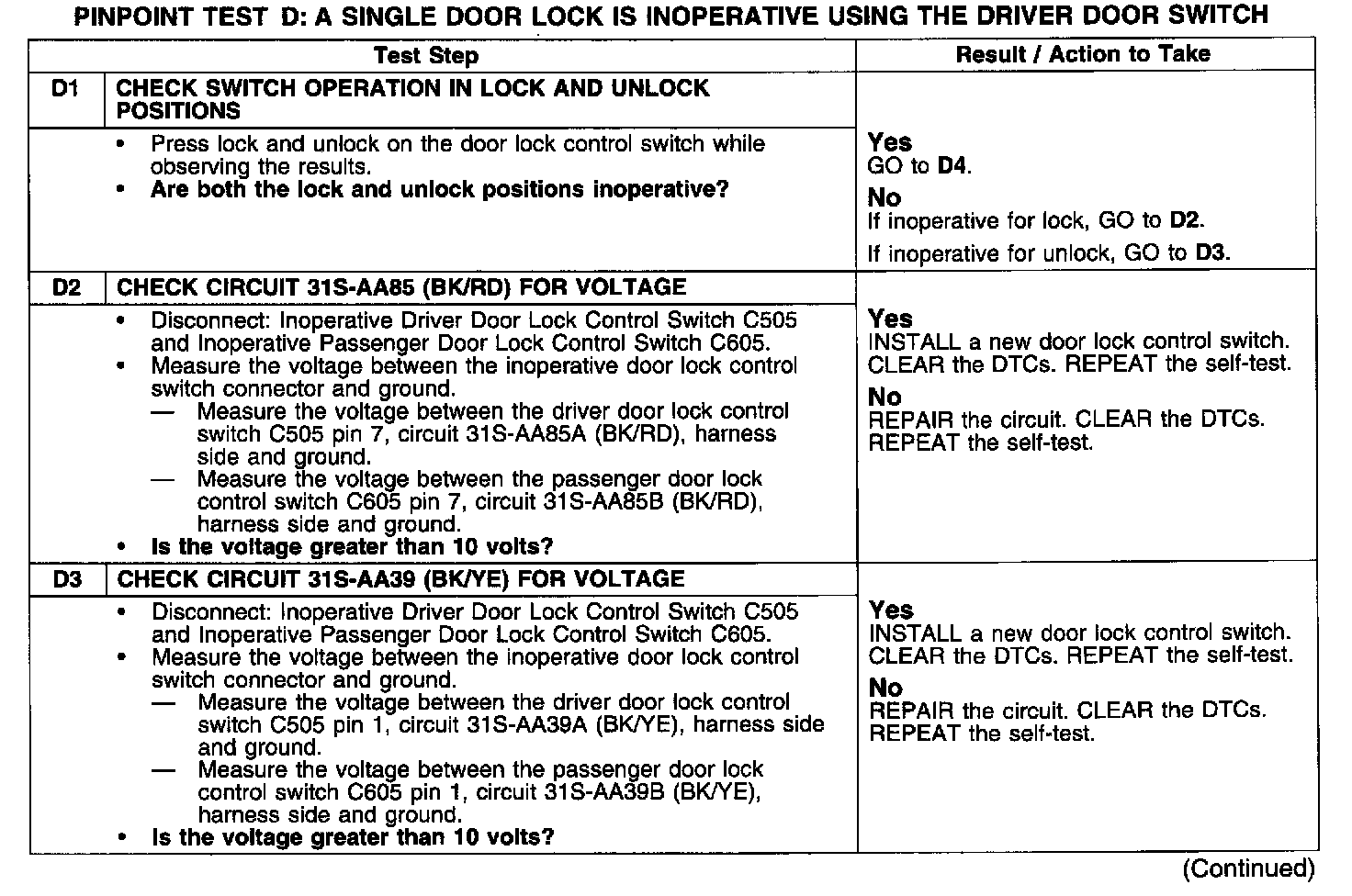 PINPOINT TEST D: A SINGLE DOOR LOCK IS INOPERATIVE USING THE DRIVER DOOR SWITCH