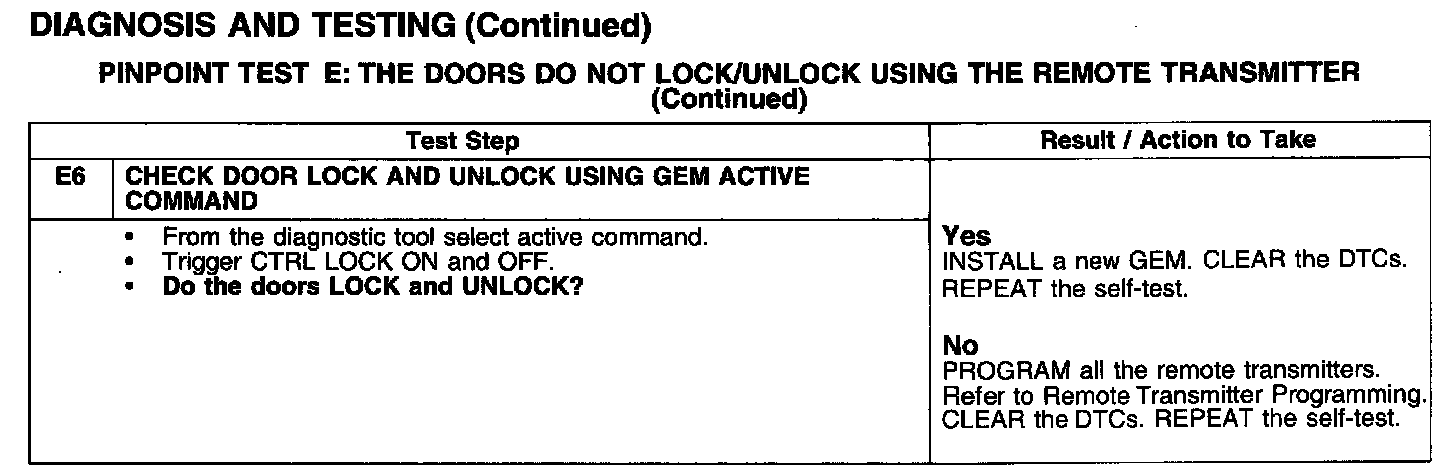 PINPOINT TEST E: THE DOORS DO NOT LOCK/UNLOCK USING THE REMOTE TRANSMITTER
