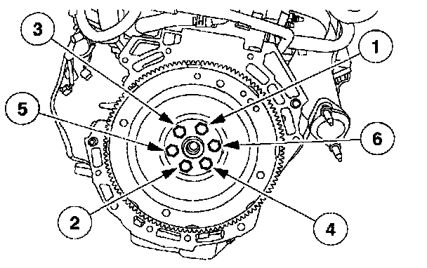 72. Install the flywheel or the flexplate and the bolts. Tighten the bolts in the sequence shown in three stages.