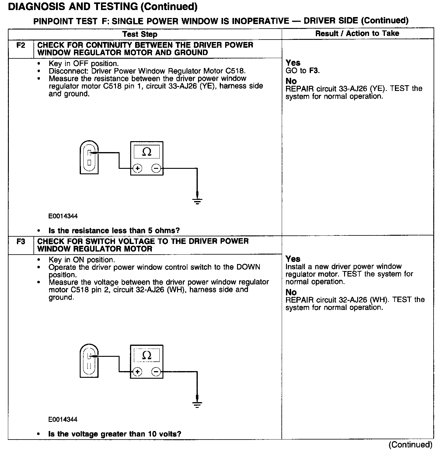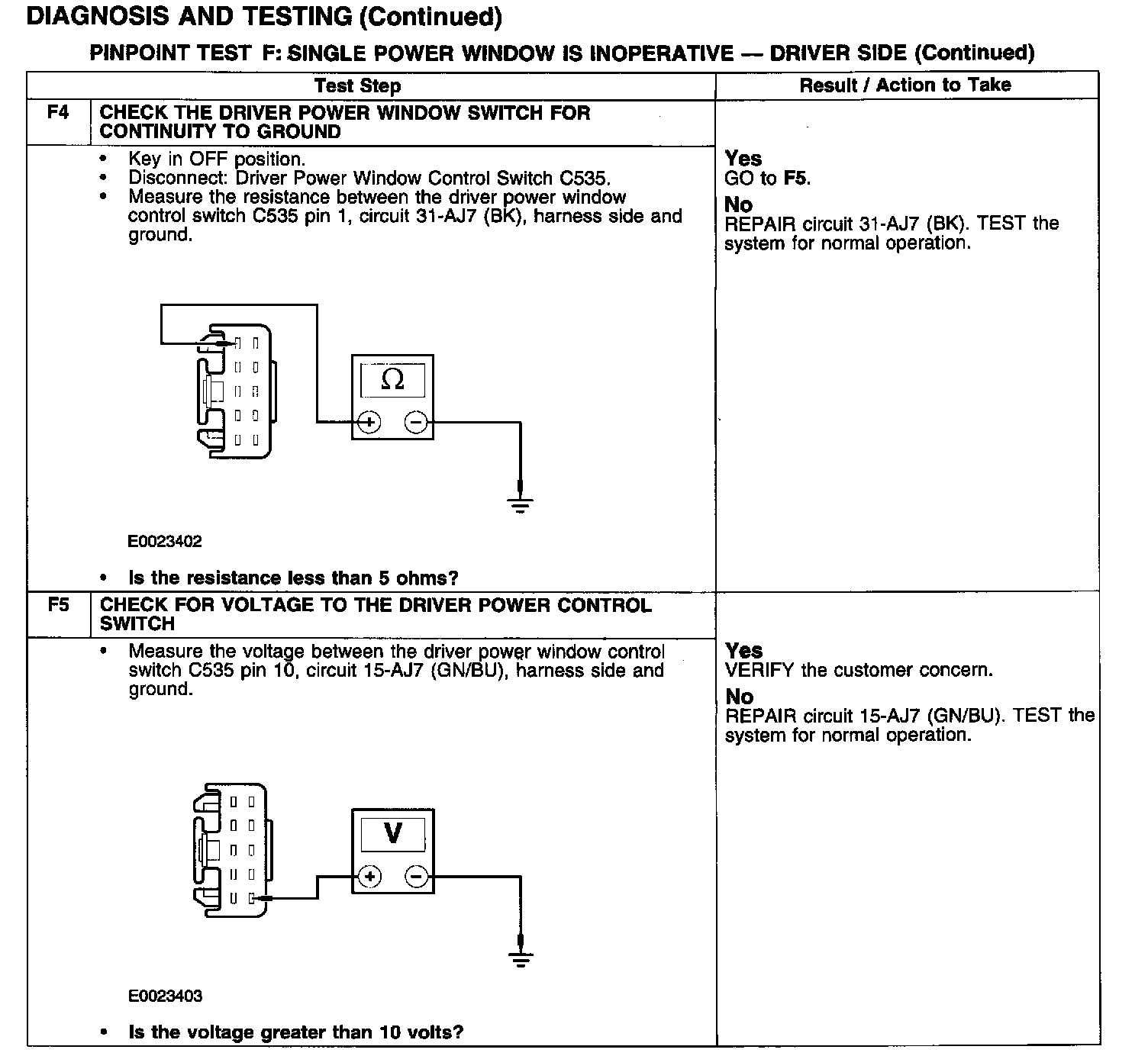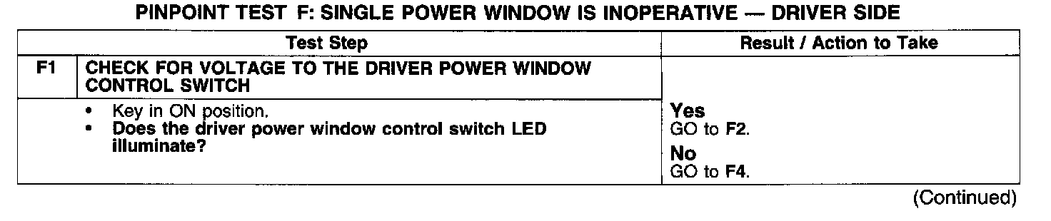 PINPOINT TEST F: SINGLE POWER WINDOW IS INOPERATIVE - DRIVER SIDE