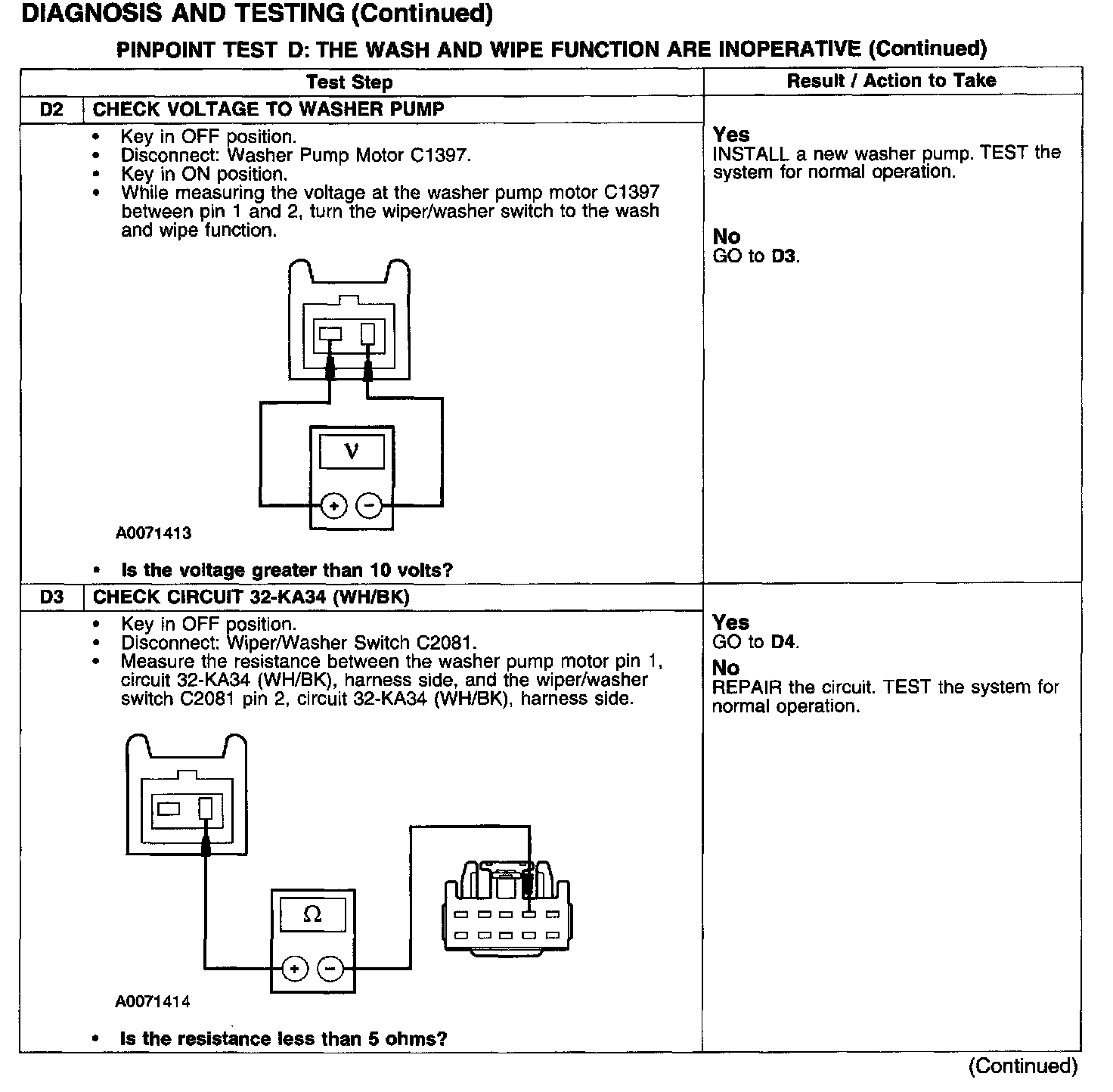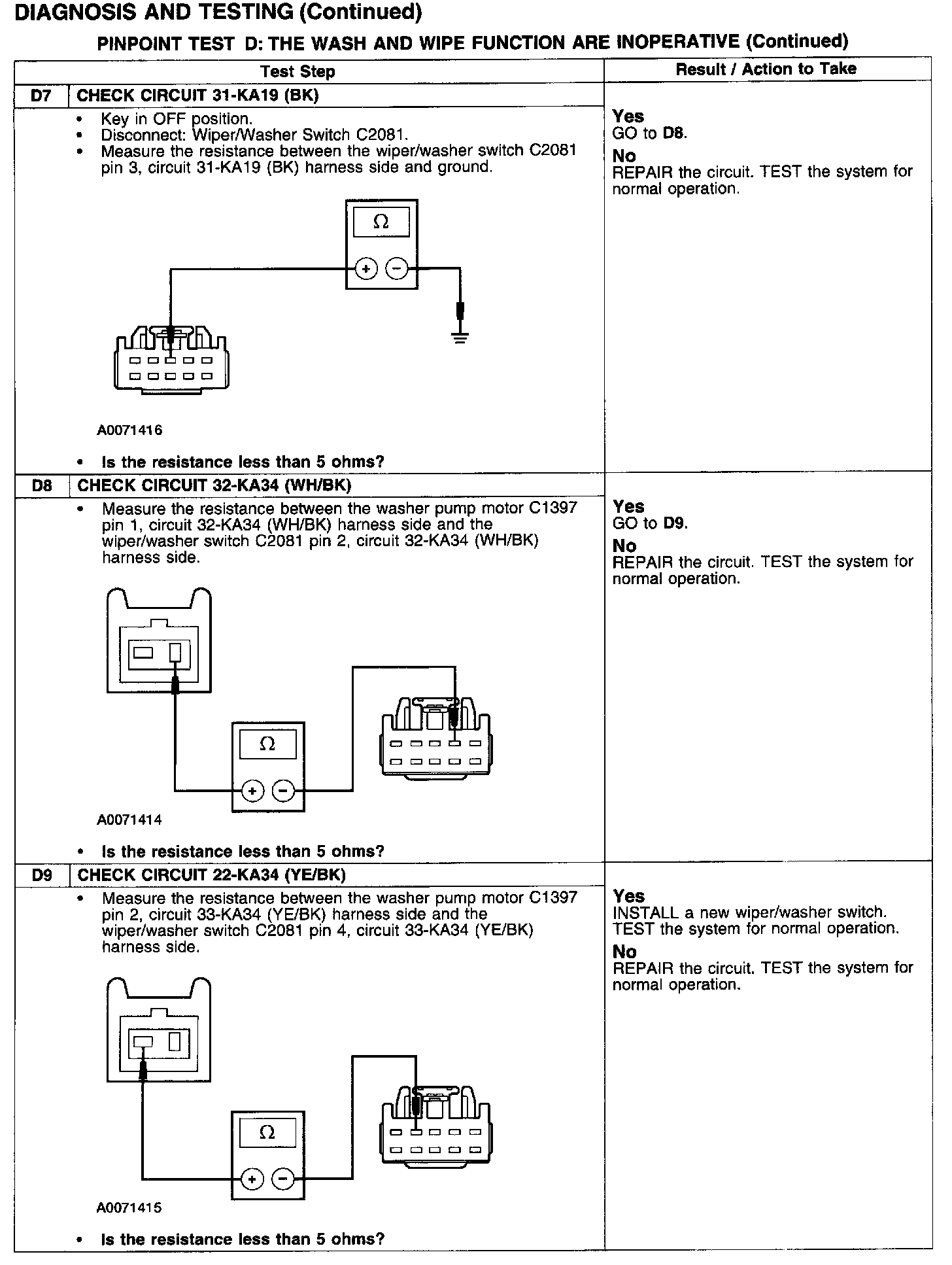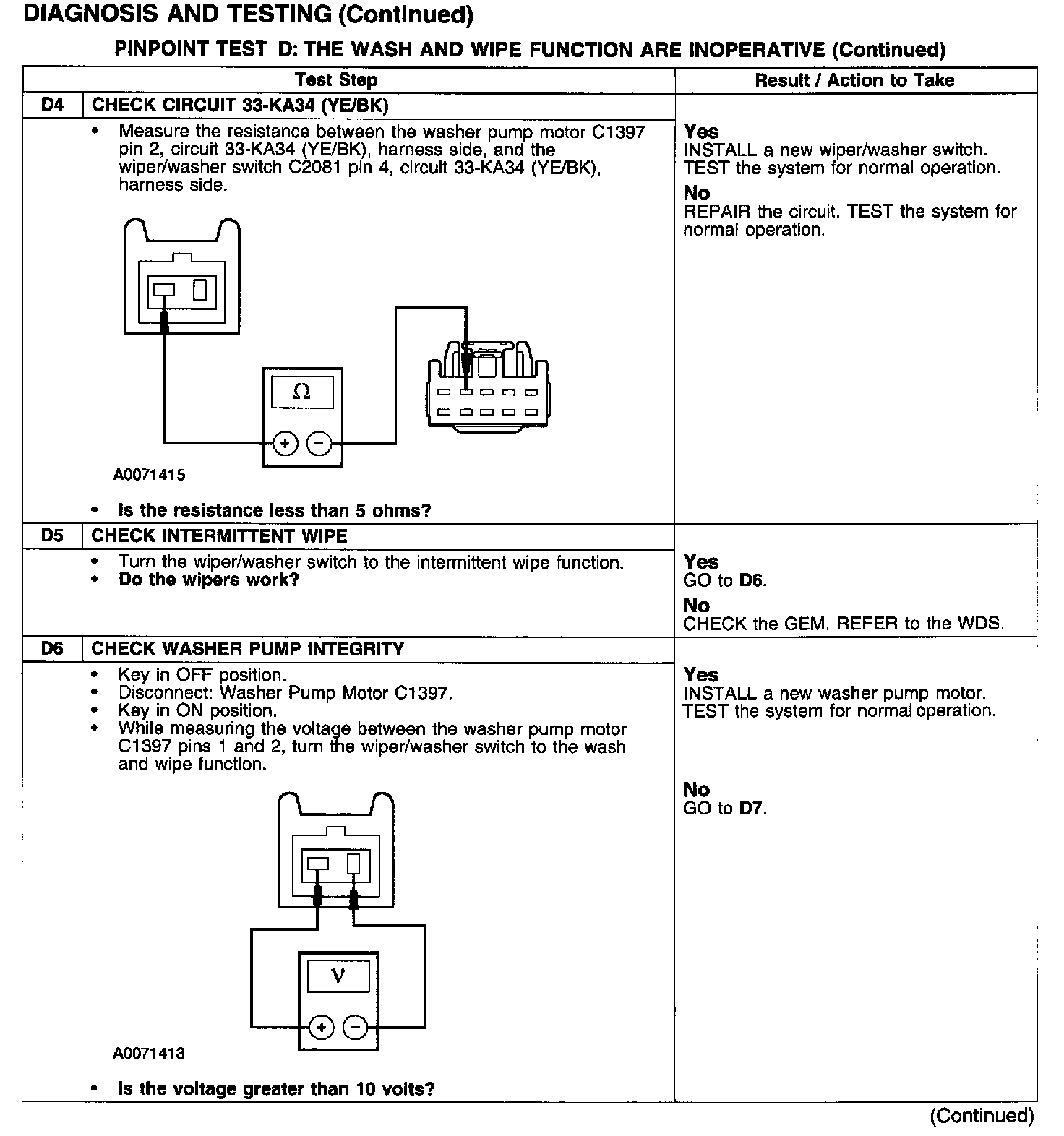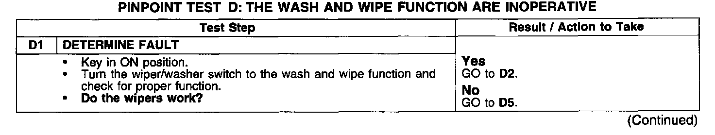 PINPOINT TEST D: THE WASH AND WIPE FUNCTION ARE INOPERATIVE