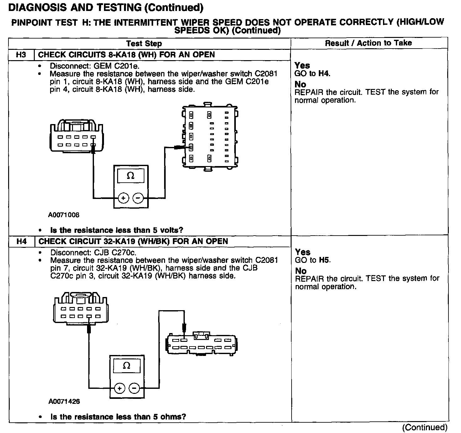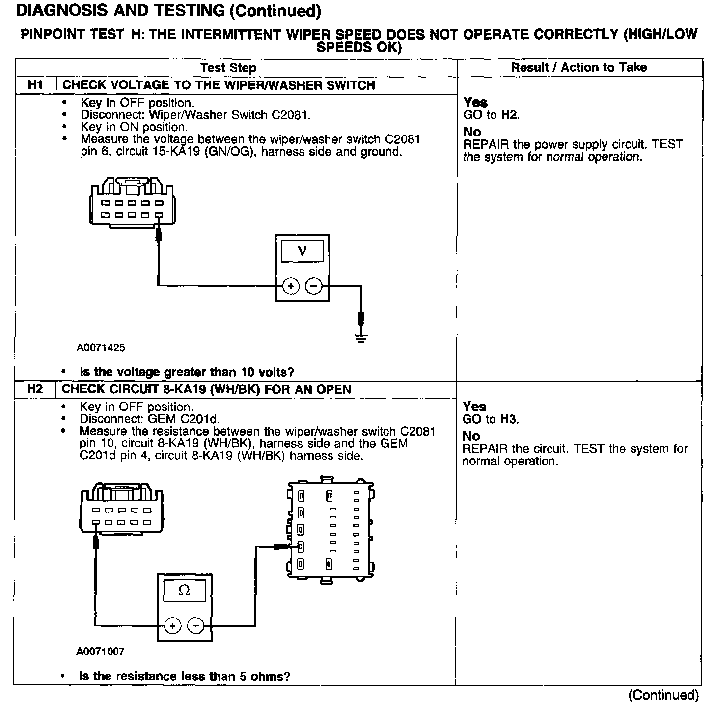 PINPOINT TEST H: THE INTERMITTENT WIPER SPEED DOES NOT OPERATE CORRECTLY (HIGH/LOW SPEEDS OK)