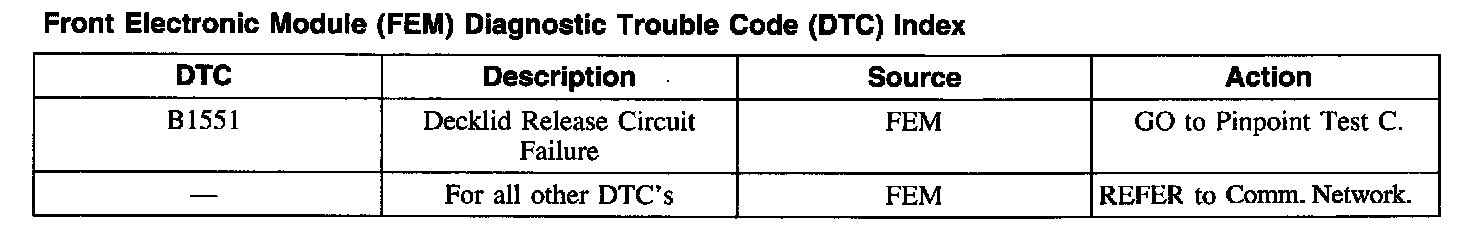 Front Electronic Module (FEM) Diagnostic Trouble Code Index