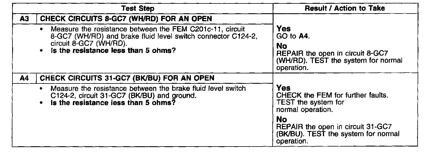 ^ An open circuit in the brake fluid level switch input signal circuit 8-GC7 (WH/RD)
