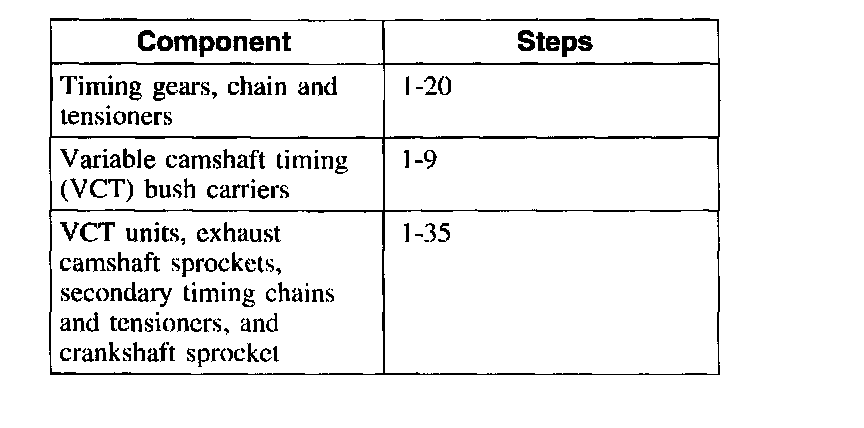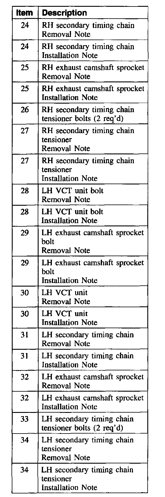 Items 28-32, and 34: LH Variable Camshaft Timing (VCT) Unit, Exhaust Camshaft Sprocket and Secondary Timing Chain Removal Note
