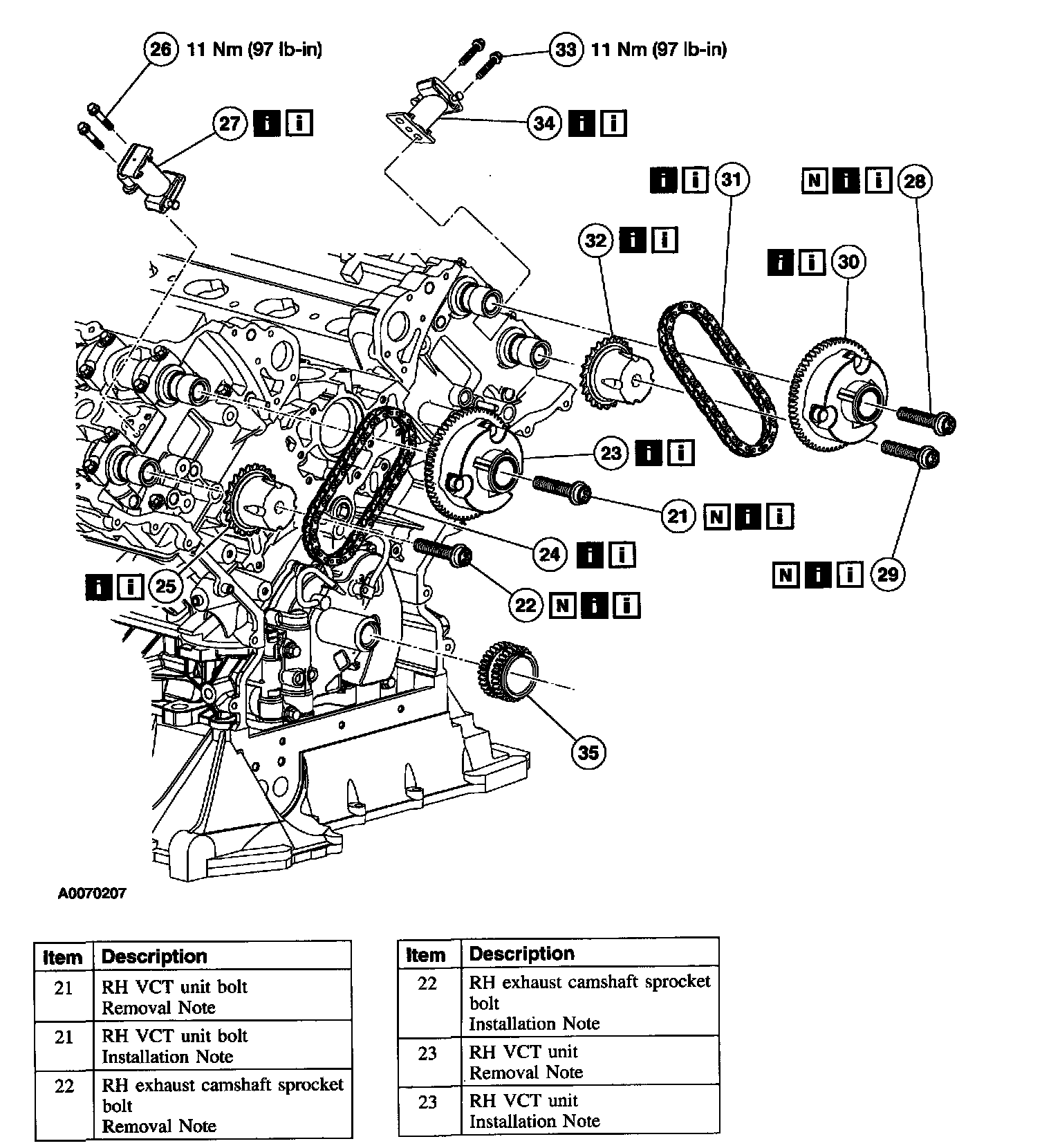 Items 21-25, and 27: RH Variable (camshaft Timing (VCT) Unit, Exhaust Camshaft Sprocket and Secondary Timing Chain Installation Note