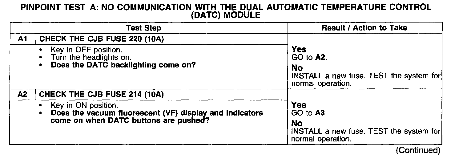 PINPOINT TEST A: NO COMMUNICATION WITH THE DUAL AUTOMATIC TEMPERATURE CONTROL (DATC) MODULETest A1-A2:
