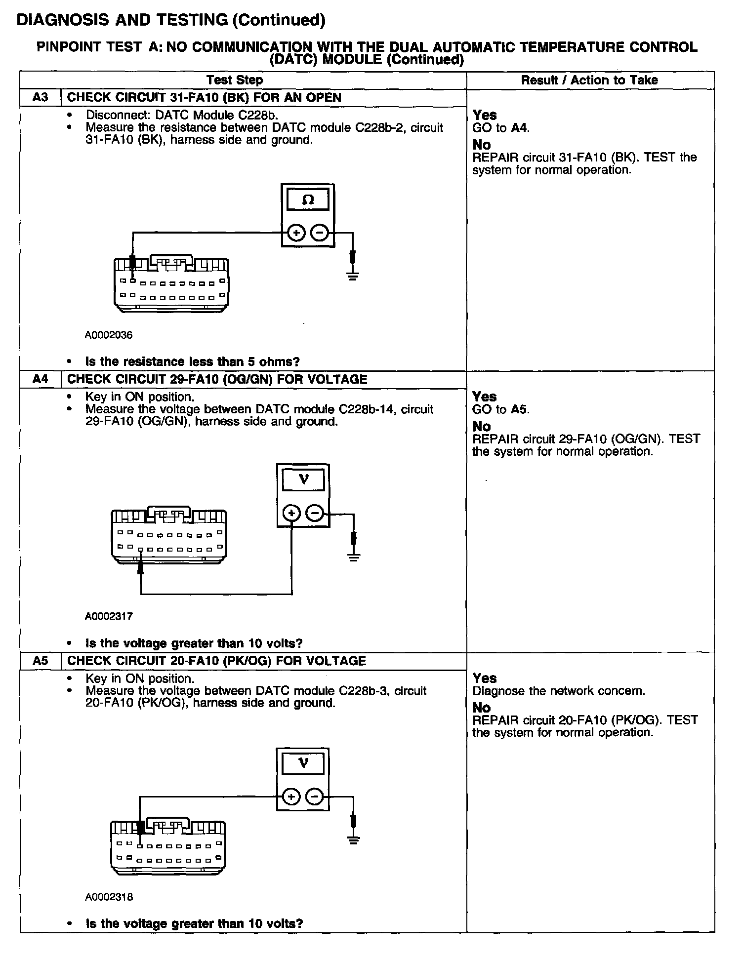Under normal operation, the Dual Automatic Temperature Control (DATC) module receives battery voltage through circuit 29-FA10 (OG/GN) and ignition voltage through circuit 20-FA10 (PK/OG). A ground is provided for the DATC module through circuit 31-FA10 (BK).