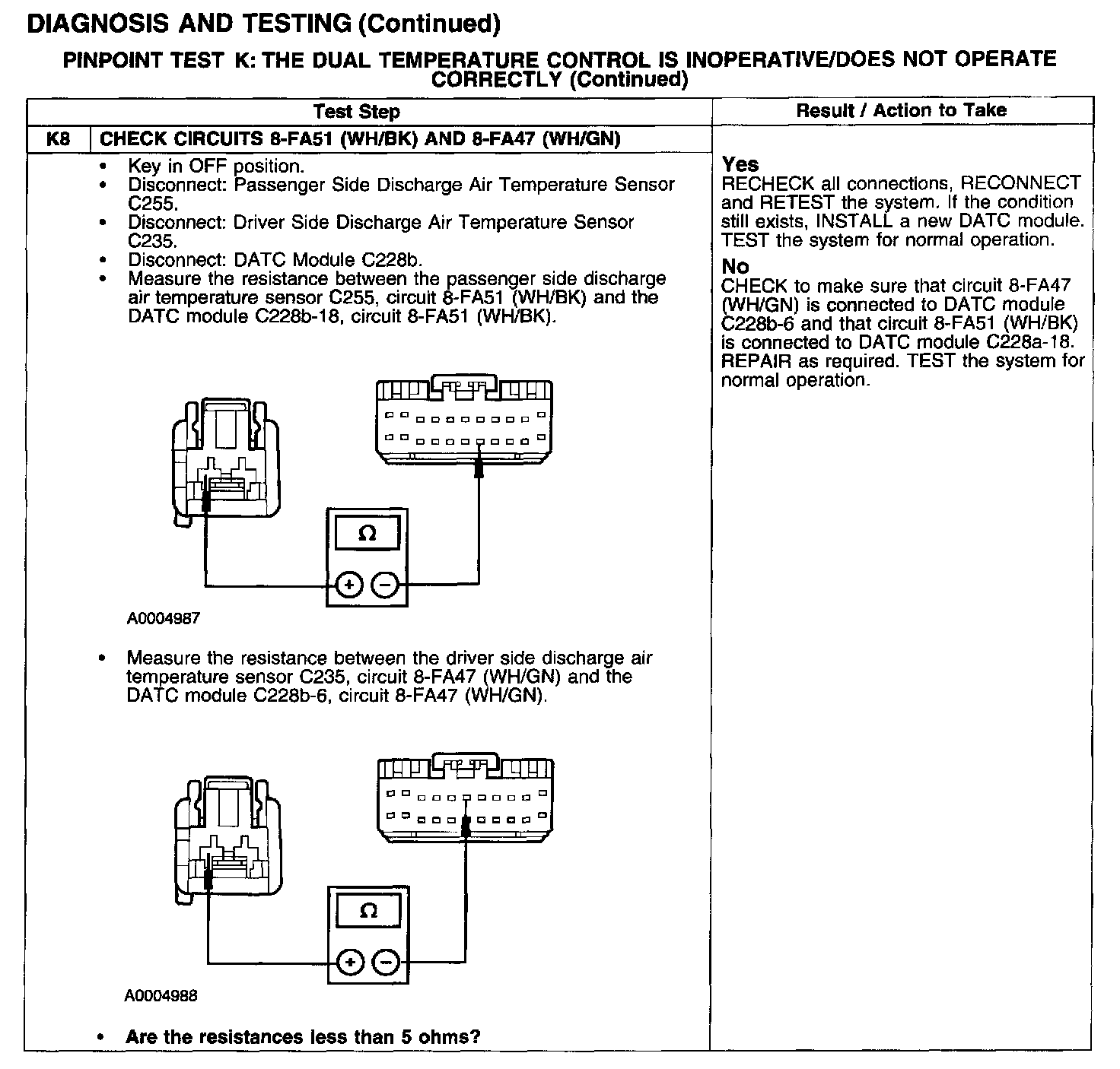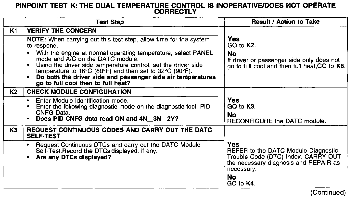 PINPOINT TEST K: THE DUAL TEMPERATURE CONTROL IS INOPERATIVE/DOES NOT OPERATE CORRECTLYTest K1-K3: