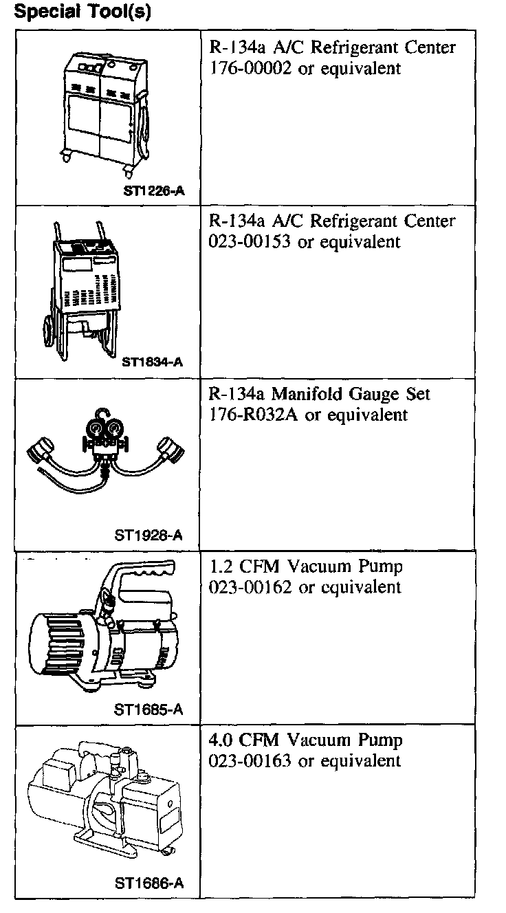 NOTE: Ford Motor Company recommends use of an A/C service center to carry out recovery, evacuation, and charging of the refrigerant system. If an A/C service center is not available, refrigerant system recovery, evacuation, and charging may be accomplished using a separate recovery station, vacuum pump, charging cylinder, and manifold gauge set.