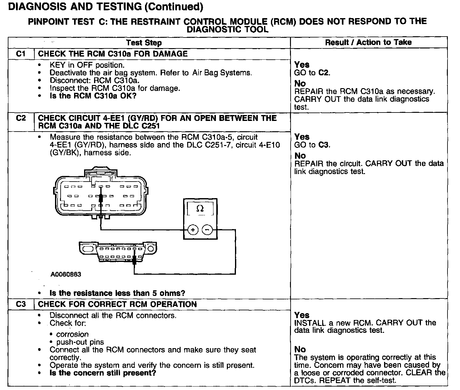 PINPOINT TEST C: THE RESTRAINT CONTROL MODULE (RCM) DOES NOT RESPOND TO THE DIAGNOSTIC TOOLTest C1-C3: