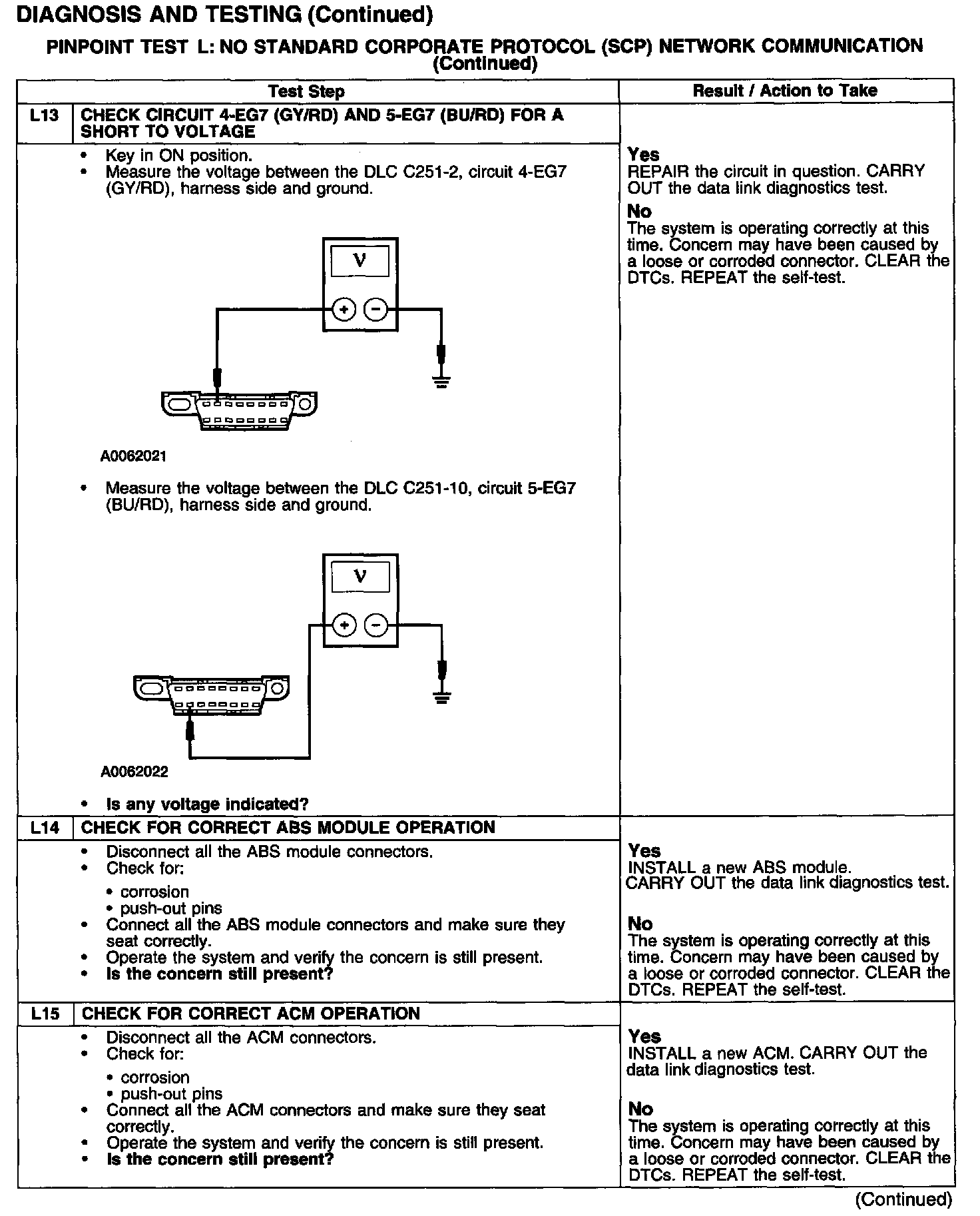 The SCP network provides data transfer between modules within the vehicle through a single pair of twisted wires. The data link connector (DLC) provides diagnostic tools access to vital SCP network and module information through circuits 4-EG7 (GY) and 5-EG7 (LB). Degraded SCP performance occurs if one bus line is open, shorted to ground or voltage, or if one but not all termination resistors are lost. To accurately diagnose the SCP communication network, the data link diagnostics test must be run with the module in question disconnected.