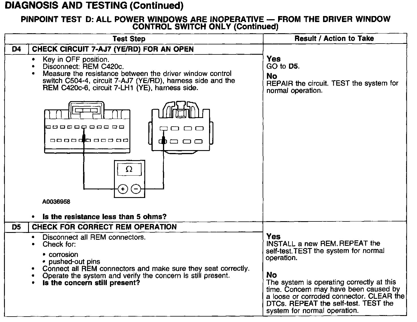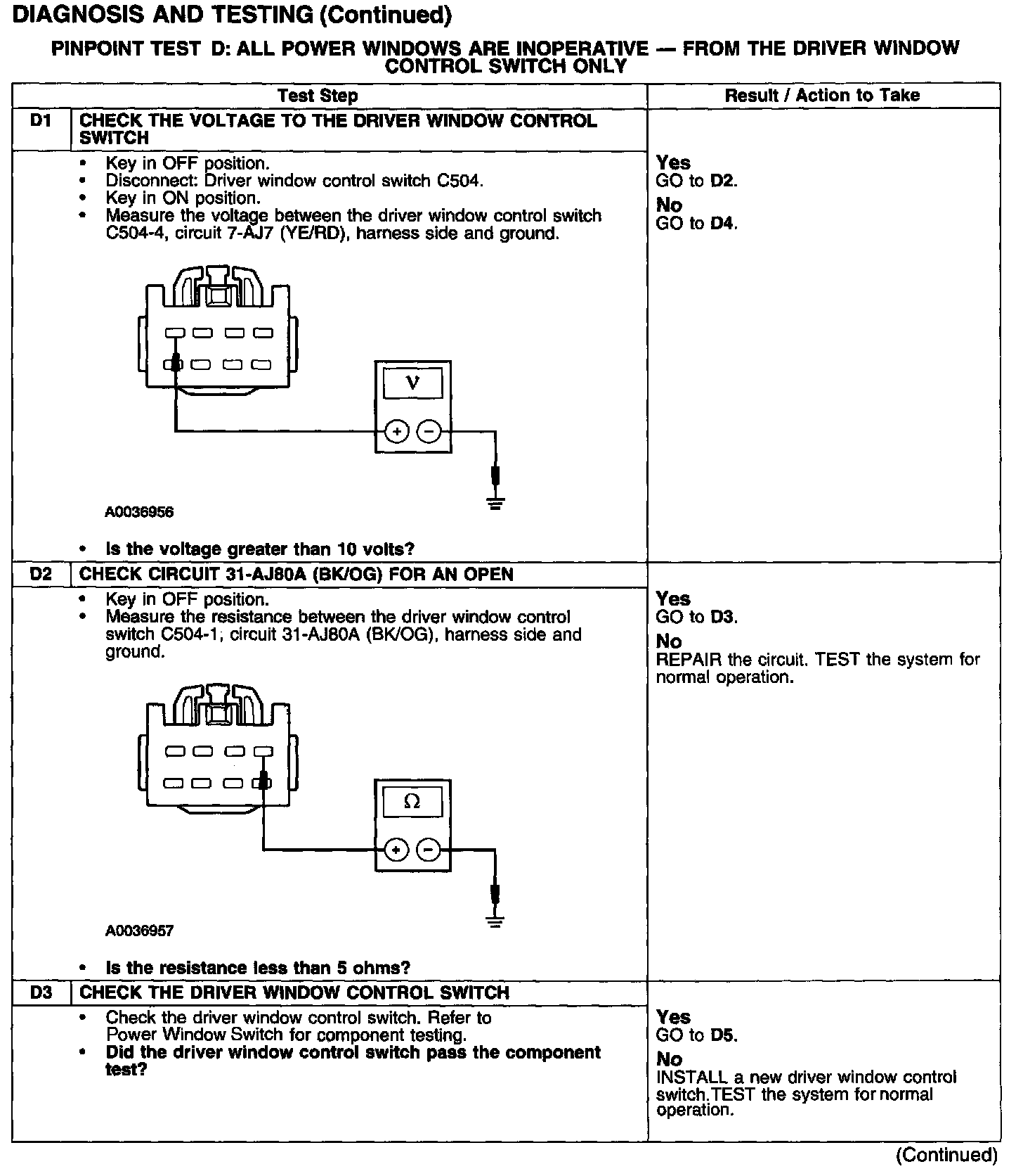 PINPOINT TEST D: ALL POWER WINDOWS ARE INOPERATIVE - FROM THE DRIVER WINDOW CONTROL SWITCH ONLYTest D1-D3: