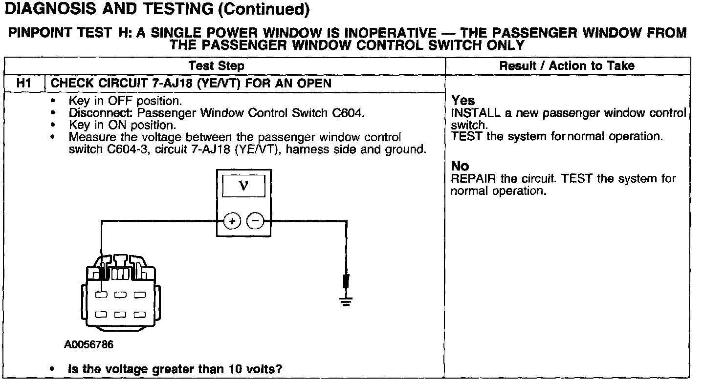 PINPOINT TEST H: A SINGLE POWER WINDOW IS INOPERATIVE - THE PASSENGER WINDOW FROM THE PASSENGER WINDOW CONTROL SWITCH ONLYTest H1: