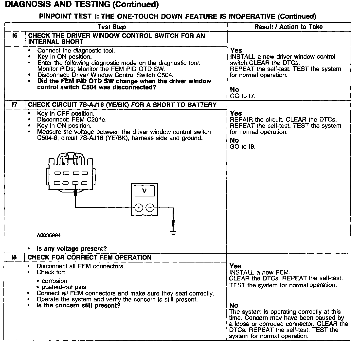 The FEM powers circuit 7S-AJ16 (YE/BK) to the driver window control switch. When the FEM detects a ground on circuit 7S-AJ16 (YE/BK), it powers and grounds the appropriate driver window motor circuits in order to accomplish the commanded one-touch down operation of the driver window.