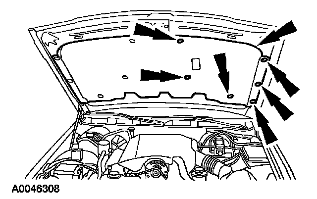 If equipped with an engine compartment lamp, remove the pin-type retainers and position the hood insulation aside.