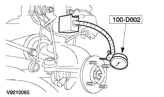6. Install a dial indicator gauge and holding fixture to the suspension strut.
