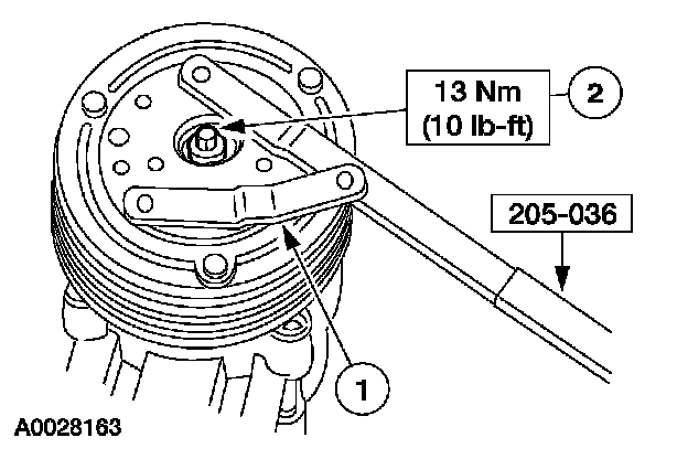 4 Use the special tool to install the A/C clutch field coil until bottomed completely against the A/C compressor.