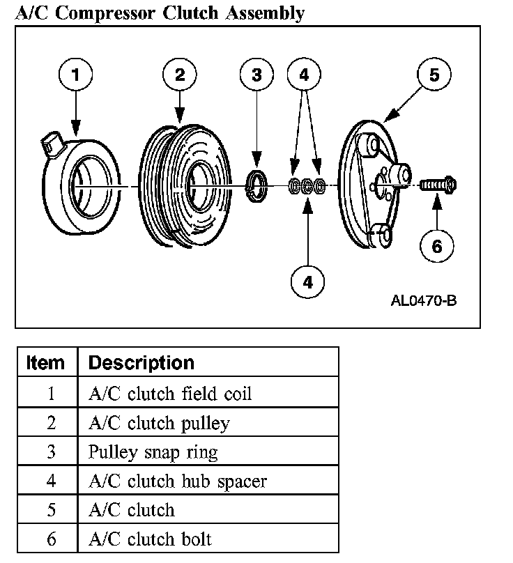 - When battery positive voltage (B+) is applied to the A/C clutch field coil, the clutch plate and hub assembly is drawn toward the A/C clutch pulley.