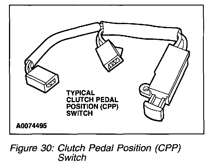 The clutch pedal position (CPP) switch (Figure 30) is an input to the PCM indicating the clutch pedal position. The PCM provides a 5-volt reference (VREF) signal to the CPP switch. If the CPP switch is closed, indicating the clutch pedal is engaged, the output voltage (5 volts) from the PCM is grounded through the signal return line to the PCM, and there is 1 volt or less. One volt or less indicates there is a reduced load on the engine. If the CPP switch is open, meaning the clutch pedal is disengaged, the input on the CPP signal to the PCM will be approximately 5 volts. Then, the 5-volt signal input at the PCM will indicate a load on the engine. The PCM uses the load information in mass air flow and fuel calculations.
