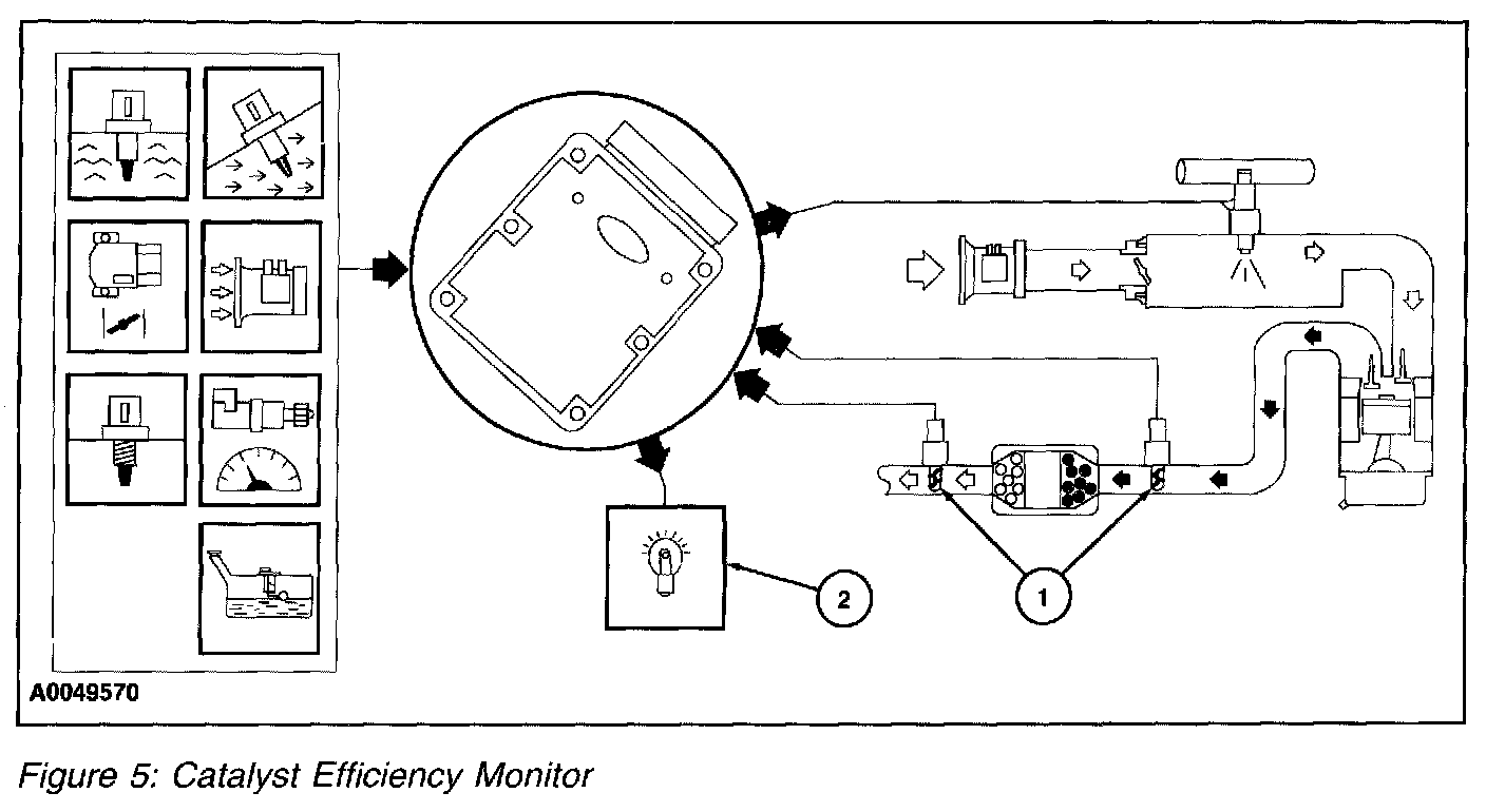 Inputs from ECT or CHT (warm engine), IAT (not extreme ambient temperatures), MAF (greater than minimum engine load), VSS (within vehicle speed window) and TP (at part-throttle) are required to enable the Catalyst Efficiency Monitor.