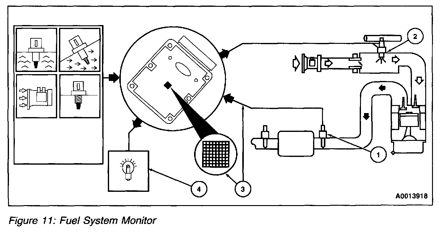 The Fuel System Monitor is an on-board strategy designed to monitor the fuel trim system. The fuel control system uses fuel trim tables stored in the PCM's Keep Alive Memory (KAM) to compensate for variability in fuel system components due to normal wear and aging. Fuel trim tables are based on engine rpm and engine load. During closed-loop fuel control, the fuel trim strategy learns the corrections needed to correct a "biased" rich or lean fuel system. The correction is stored in the fuel trim tables. The fuel trim has two means of adapting; Long Term Fuel Trim and a Short Term Fuel Trim. Both are described in greater detail under Powertrain Control Software, Fuel Trim. Long Term relies on the fuel trim tables and Short Term refers to the desired air/fuel ratio parameter called "LAMBSE". LAMBSE is calculated by the PCM from HO2S inputs and helps maintain a 14.7:1 air/fuel ratio during closed-loop operation. Short Term Fuel Trim and Long Term Fuel Trim work together. If the HO2S indicates the engine is running rich, the PCM will correct the rich condition by moving Short Term Fuel Trim in the negative range (less fuel to correct for a rich combustion). If after a certain amount of time the Short Term Fuel Trim is still compensating for a rich condition, the PCM "learns" this and moves the Long Term Fuel Trim into the negative range to compensate and allows Short Term Fuel Trim to return to a value near 0%. Input from the ECT or CHT, IAT, and MAF sensors is required to activate the fuel trim system, which in turn activates the Fuel System Monitor. Once activated, the Fuel System Monitor looks for the fuel trim tables to reach the adaptive clip (adaptive limit) and LAMBSE to exceed a calibrated limit. The Fuel System Monitor will store the appropriate DTC when a fault is detected as described below.