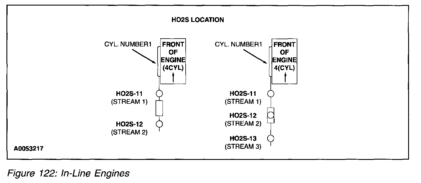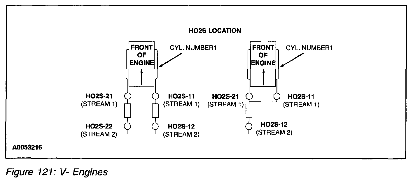 The number of HO2S(s) used in the exhaust stream and the location of these sensors depend on the vehicle emission certification level (i.e. LEV, ULEV, PZEV). Refer to (Figure 121) and (Figure 122) for typical HO2S stream locations and naming convention. On most vehicles only two HO2S are used in an exhaust stream. The front sensors (HO2S11/HO2S21) before the catalyst will be used for primary fuel control while the ones after the catalyst (HO2S12/HO2S22) will be utilized to monitor catalyst efficiency. However, some Partial Zero Emission Vehicles (PZEV) will utilize three HO2S sensors for each engine bank. The stream 1 sensors (HO2S11/HO2S21) before the catalyst will be used for primary fuel control, the next group of sensors or stream 2 (HO2S12/HO2S22) is utilized to monitor the light-off catalyst and the last group of sensors or stream 3 (HO2S13/HO2S23) is utilized for long term fuel trim control to optimize catalyst efficiency (Fore Aft Oxygen Sensor Control). Currently Ford's PZEV vehicles use only a 4-cylinder engine, so only the Bank 1 HO2S(s) will be utilized.