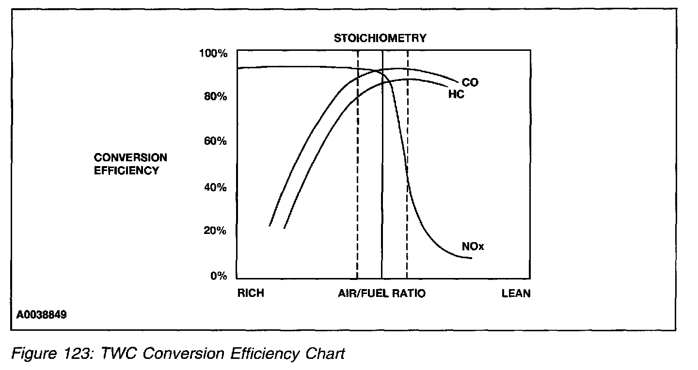 A TWC requires a stoichiometric fuel ratio, 14.7 pounds of air to 1 pound of fuel (14.7:1), for high conversion efficiency. In order to achieve these high efficiencies, the air/fuel ratio must be tightly controlled with a narrow window of stoichiometry. Deviations outside of this window will greatly decrease the conversion efficiency (Figure 123). For example a rich mixture will decrease the HC and CO conversion efficiency while a lean mixture will decreases the NOx conversion efficiency.