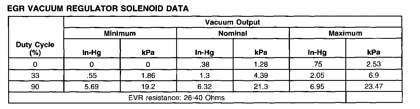 3. The EGR vacuum regulator solenoid receives a variable duty cycle signal (0 to 100%). The higher the duty cycle the more vacuum the solenoid diverts to the EGR valve.