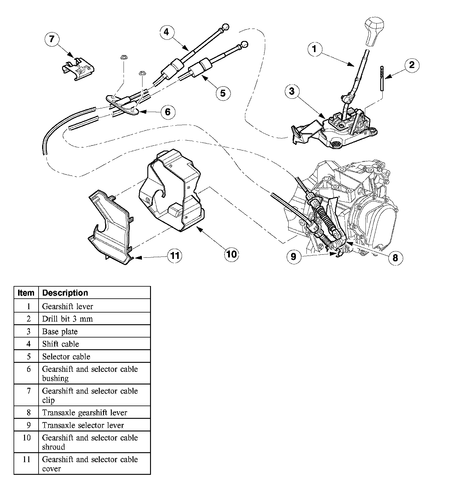 The shift mechanism is adjusted using a 3 mm drill bit on the gearshift lever and by means of the selector cable on the transaxle. It is not possible to adjust the shift cable.