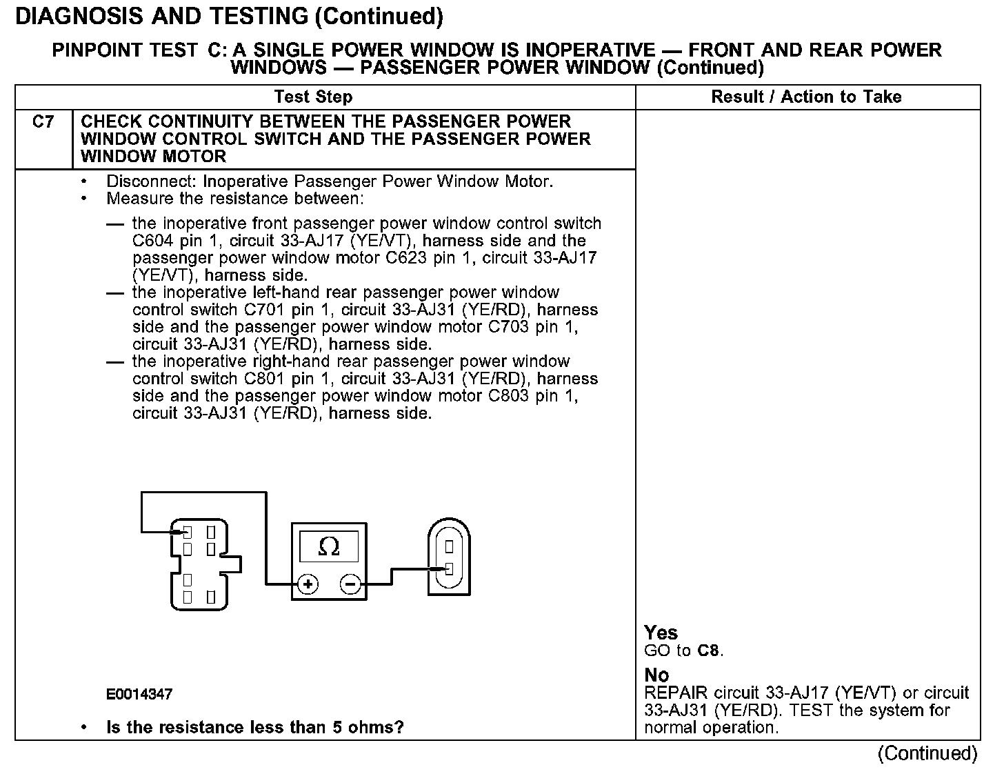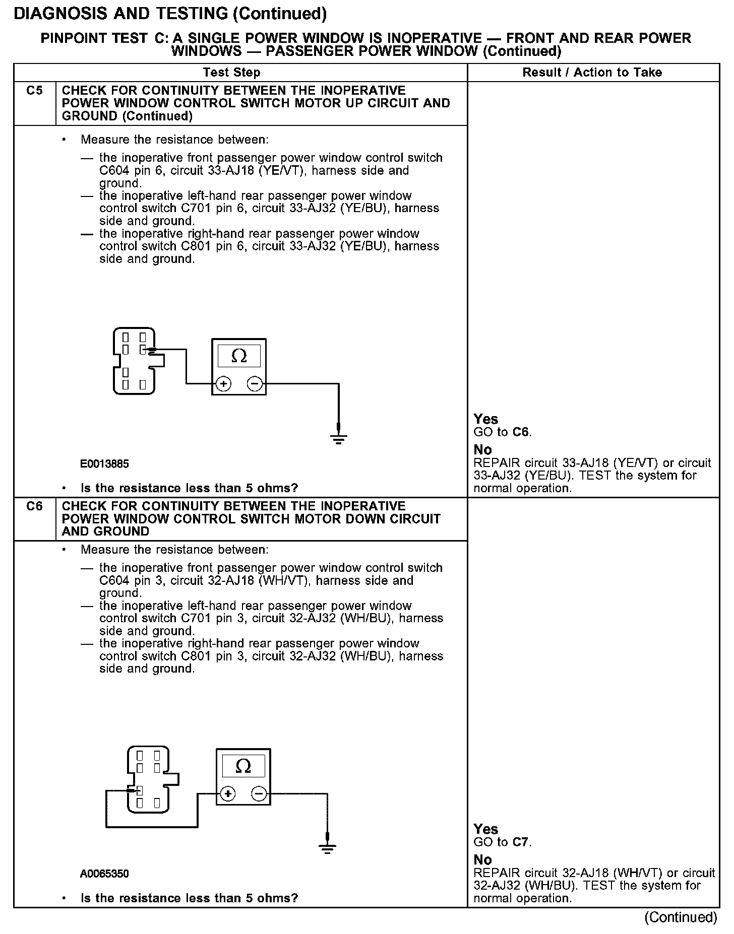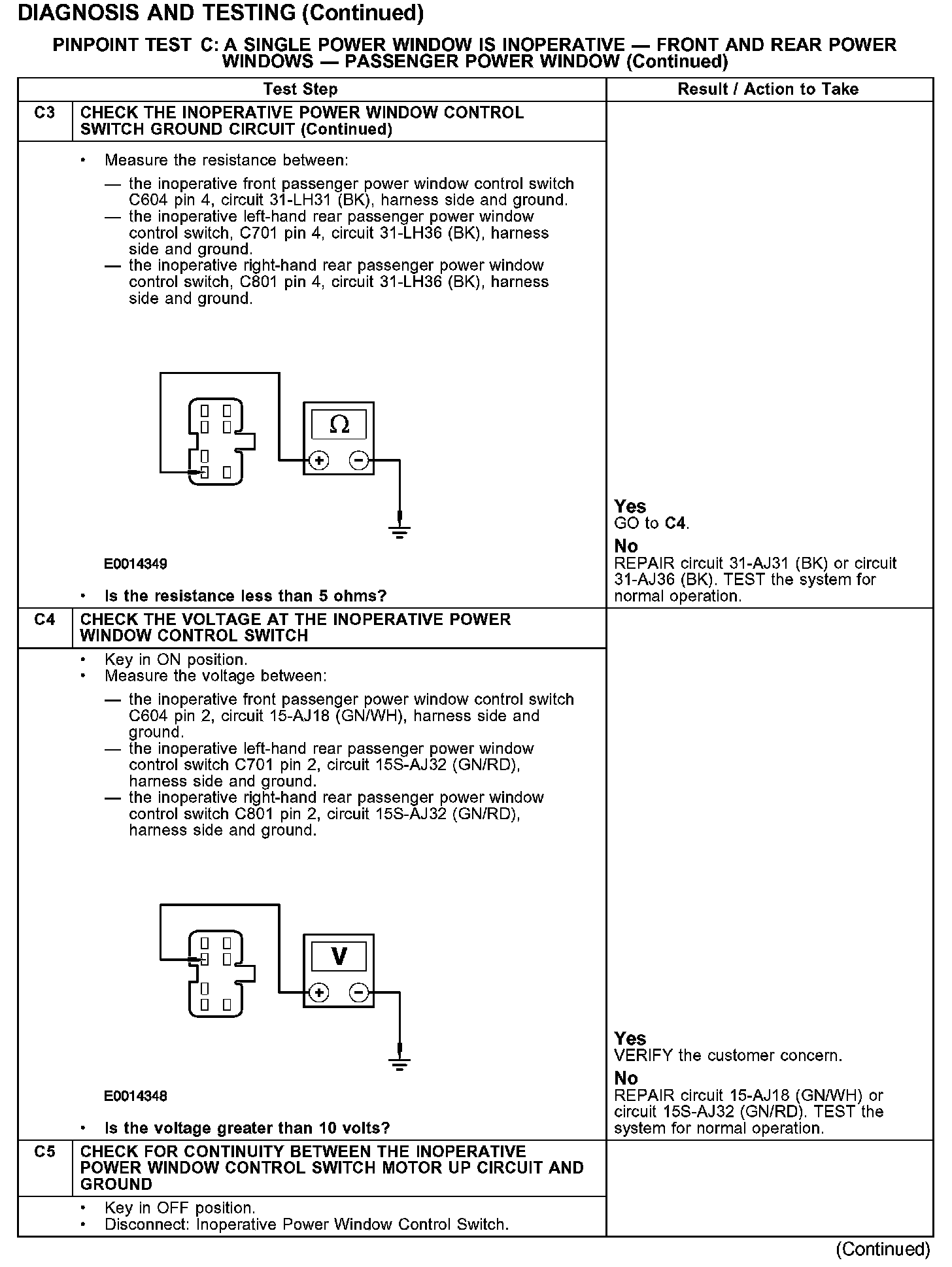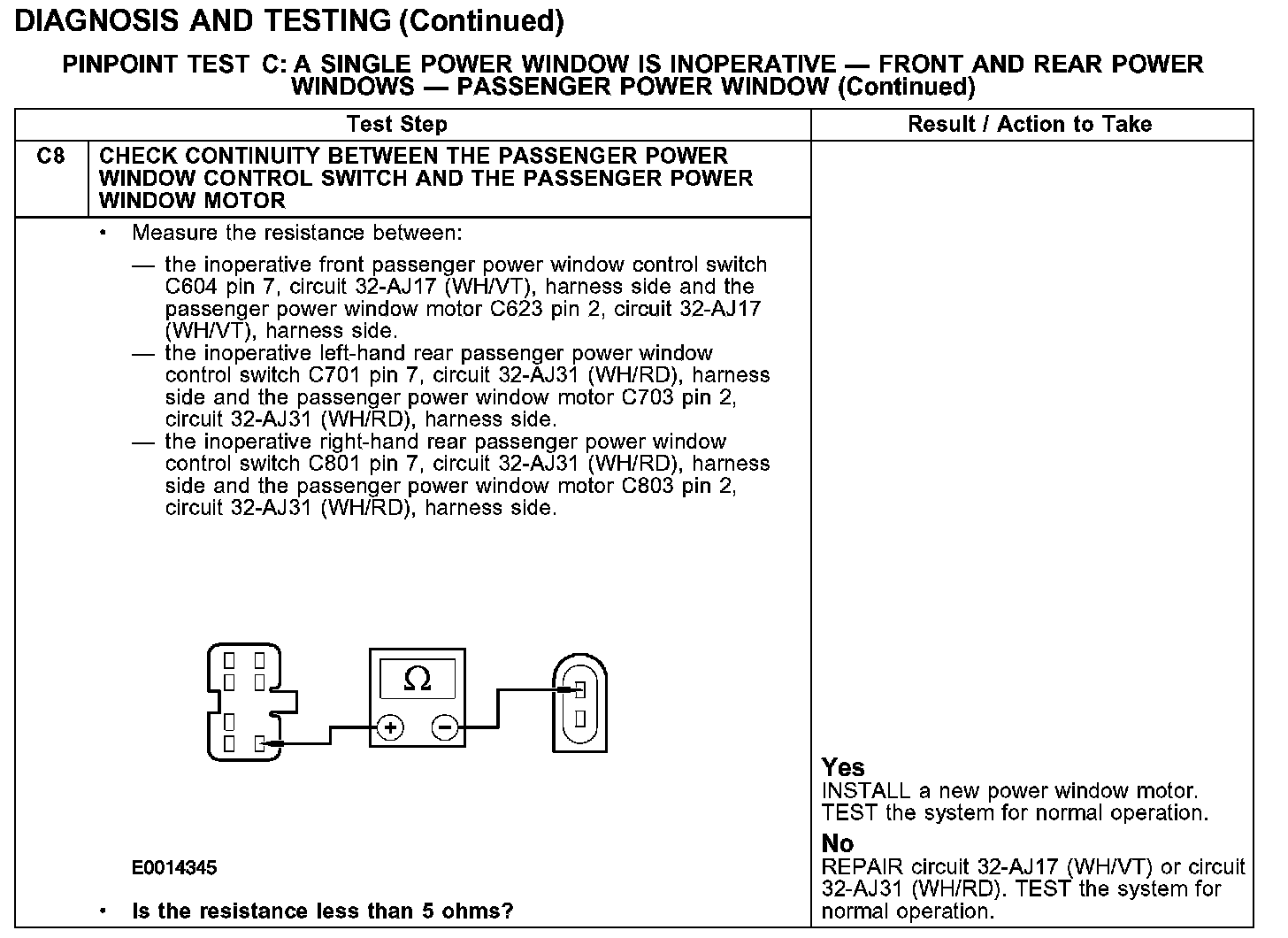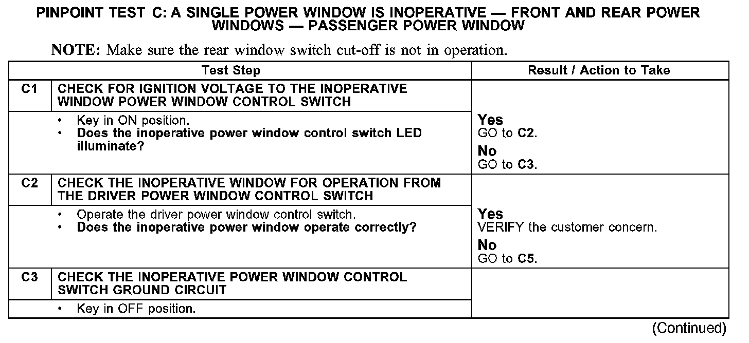 PINPOINT TEST C: A SINGLE POWER WINDOW IS INOPERATIVE - FRONT AND REAR POWER WINDOWS - PASSENGER POWER WINDOW