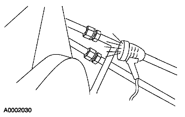 NOTE: Ford Motor Company vehicles are produced with R-134a fluorescent dye installed in the refrigerant system from the factory. The location of leaks can be pinpointed by the bright yellow-green glow of the fluorescent dye under a UV lamp. Since more than one leak can exist, make sure to inspect each component, line, and fitting in the refrigerant system for a leak.