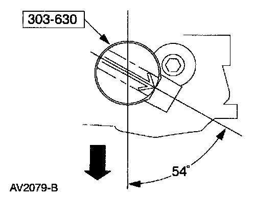 Install the camshaft synchronizer housing assembly so the arrow on the special tool is 54 degrees from the center line of the engine.