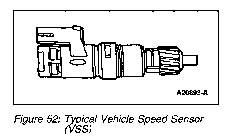 The vehicle speed sensor (VSS) (Figure 52) is a variable reluctance or Hall-effect sensor that generates a waveform with a frequency that is proportional to the speed of the vehicle. If the vehicle is moving at a relatively low velocity, the sensor produces a signal with a low frequency. As the vehicle velocity increases, the sensor generates a signal with a higher frequency. The PCM uses the frequency signal generated by the VSS (and other inputs) to control such parameters as fuel injection, ignition control, transmission/transaxle shift scheduling and torque converter clutch scheduling.