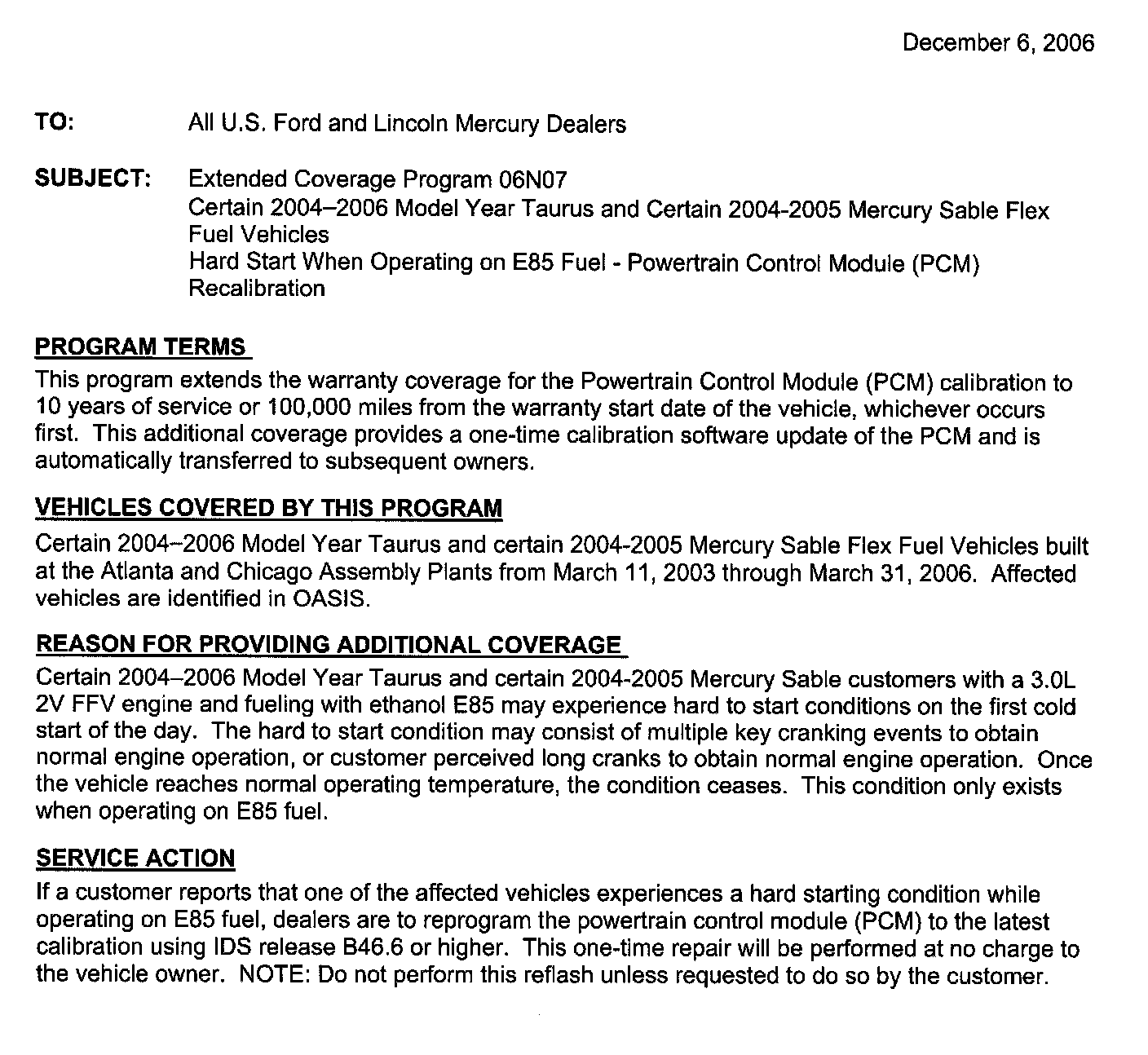 Campaign - Hard Start on E85 - PCM Recalibration