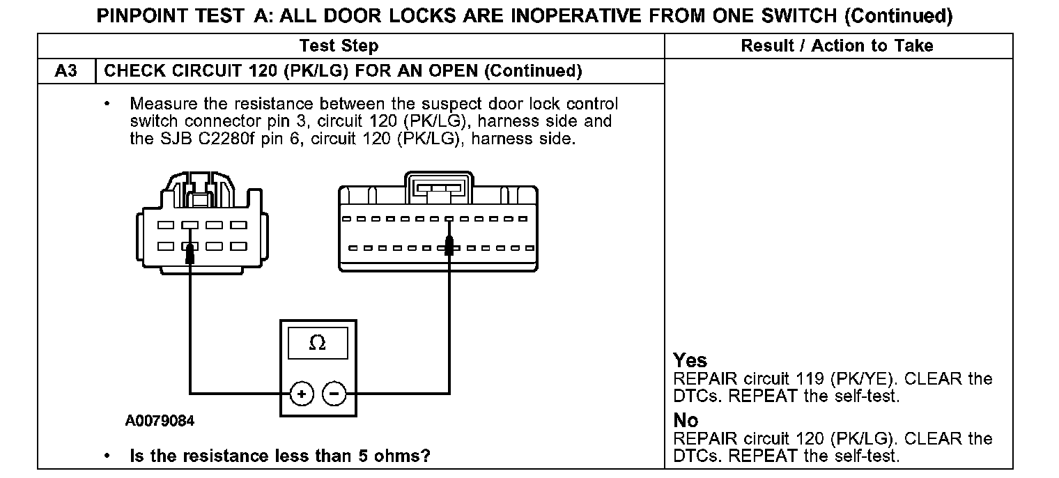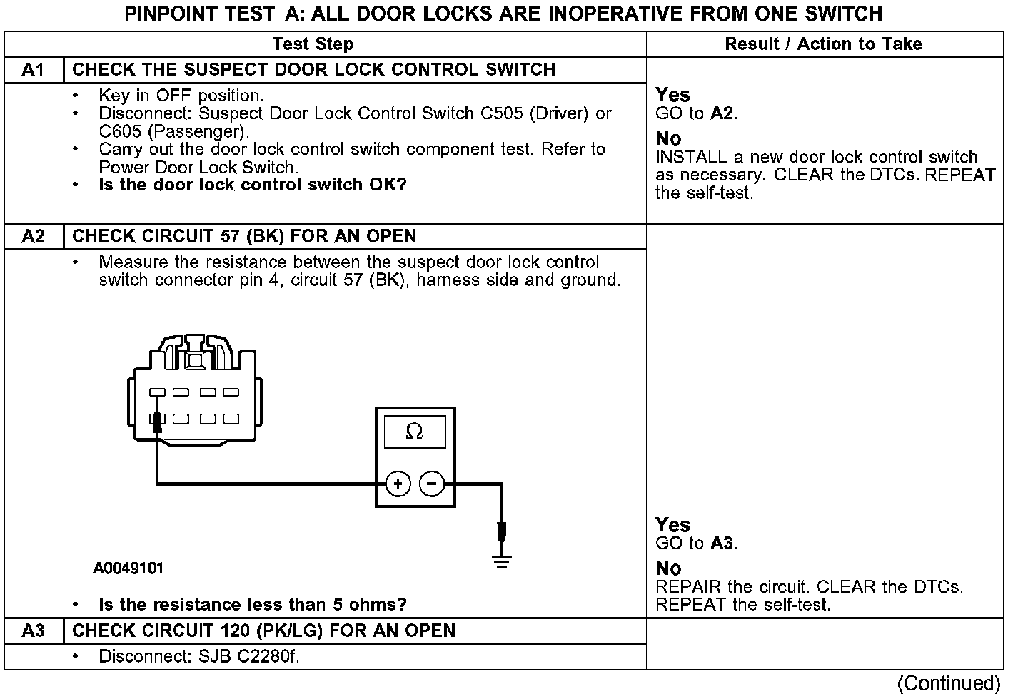 PINPOINT TEST A: ALL DOOR LOCKS ARE INOPERATIVE FROM ONE SWITCH