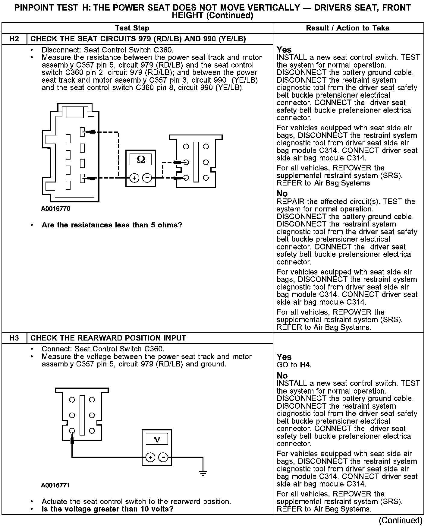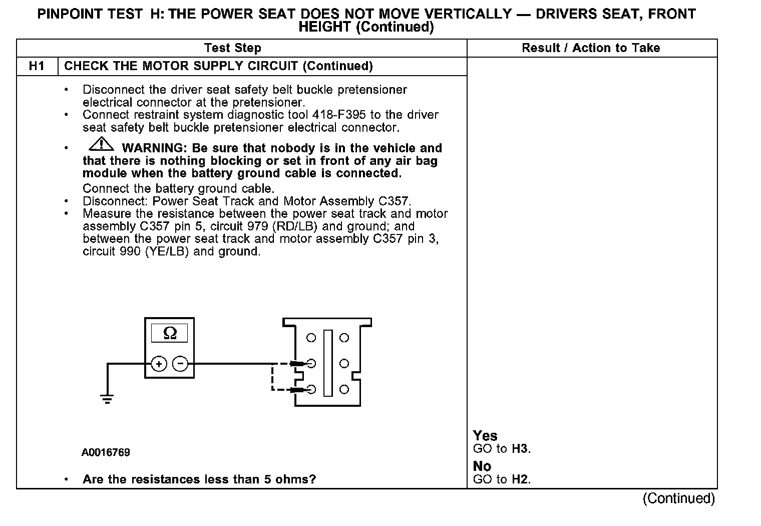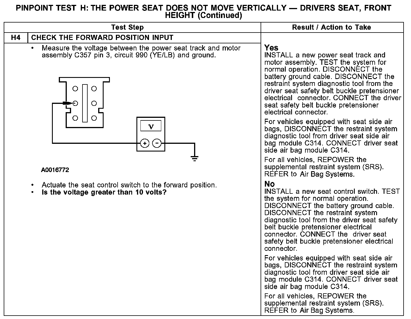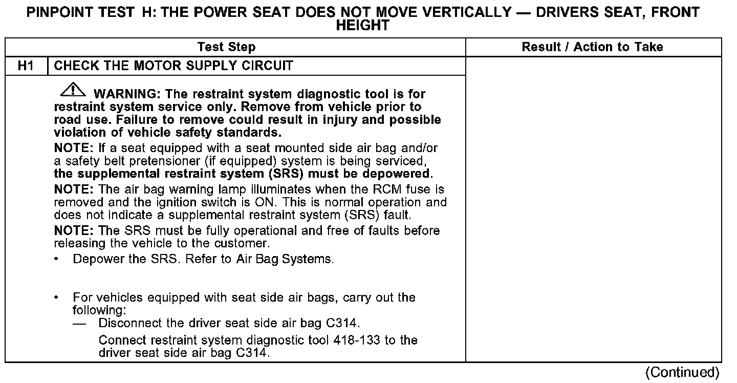 PINPOINT TEST H: THE POWER SEAT DOES NOT MOVE VERTICALLY - DRIVERS SEAT, FRONT HEIGHT