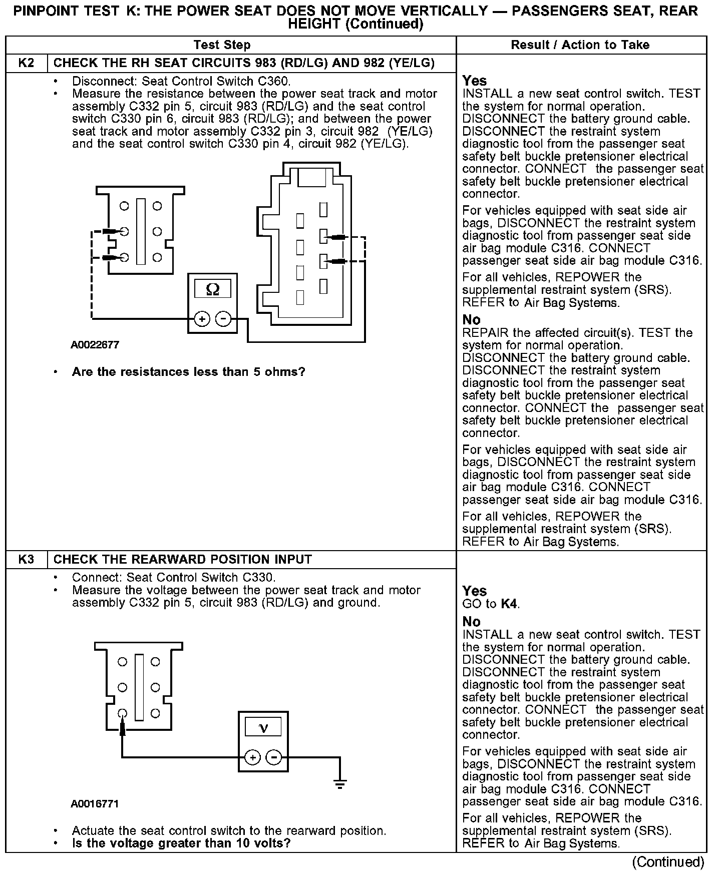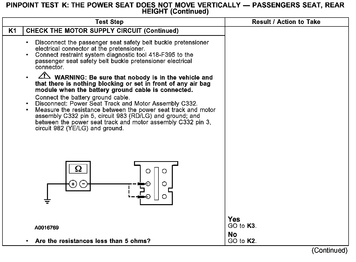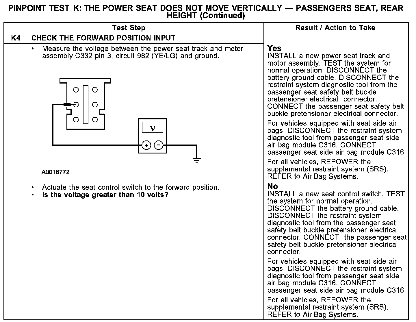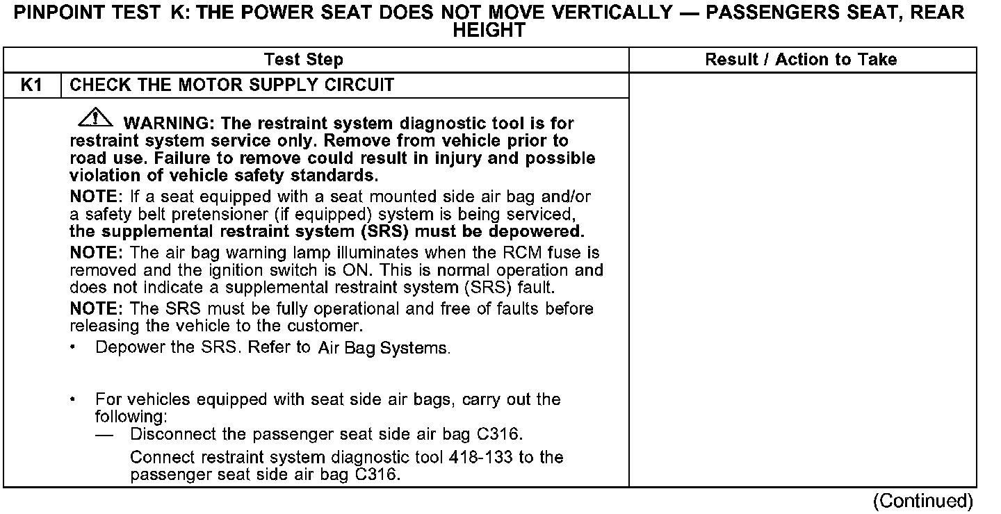 PINPOINT TEST K: THE POWER SEAT DOES NOT MOVE VERTICALLY - PASSENGERS SEAT, REAR HEIGHT