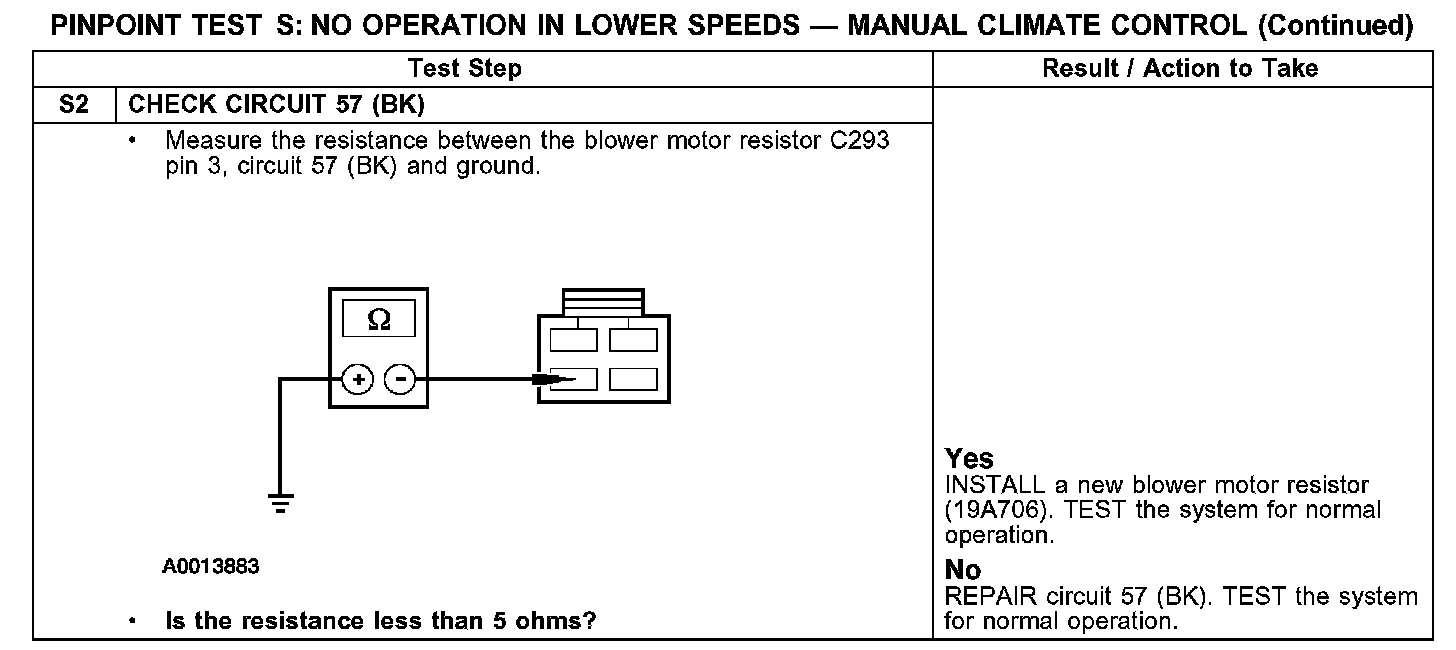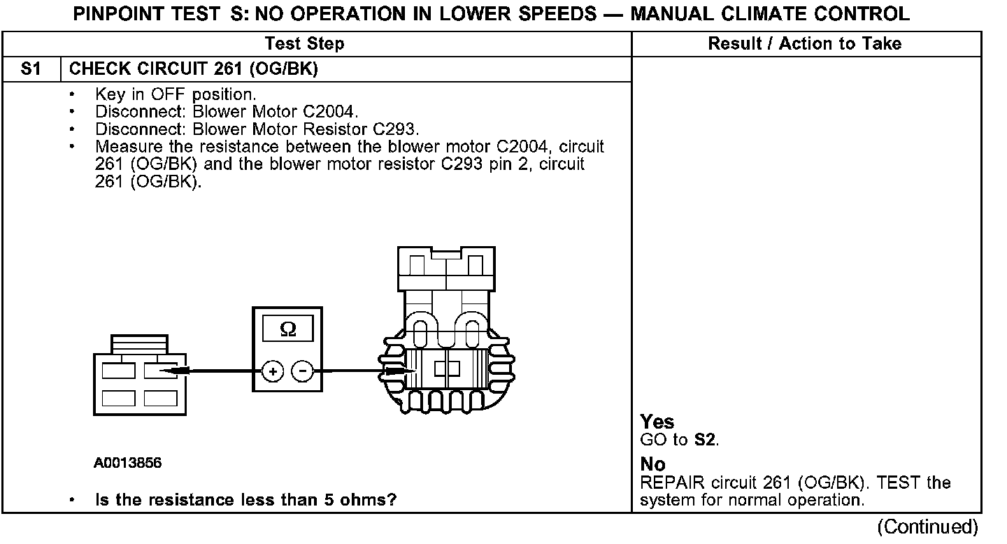 PINPOINT TEST S: NO OPERATION IN LOWER SPEEDS - MANUAL CLIMATE CONTROL