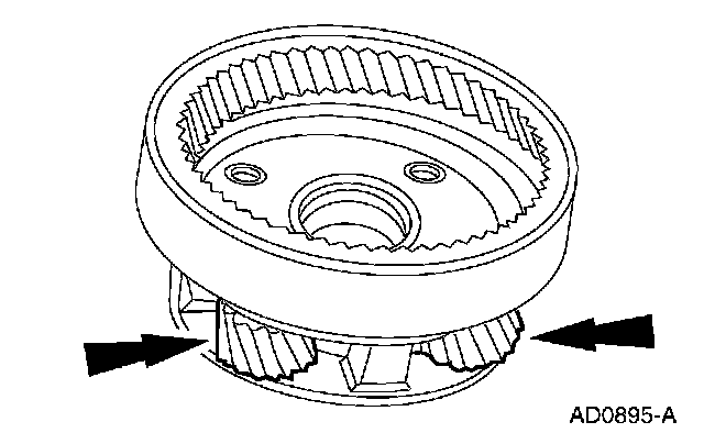 2. Remove the front planet gear assembly. Clean and inspect for looseness and discoloration of the pinion gears or wear on the bearings. Repair as required.