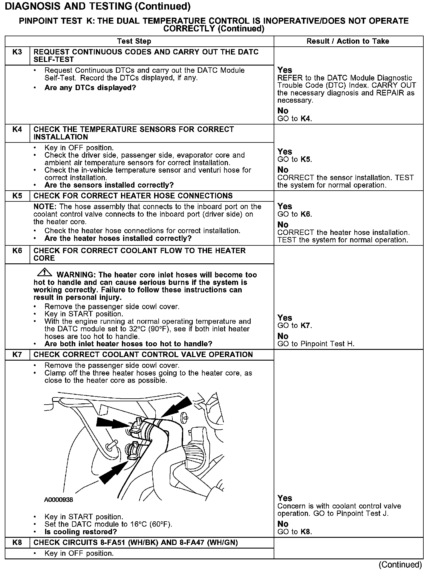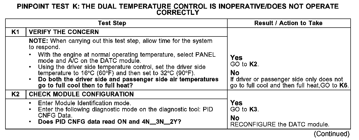 PINPOINT TEST K: THE DUAL TEMPERATURE CONTROL IS INOPERATIVE/DOES NOT OPERATE CORRECTLYTest K1-K2: