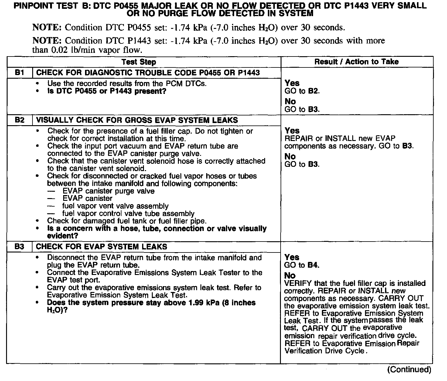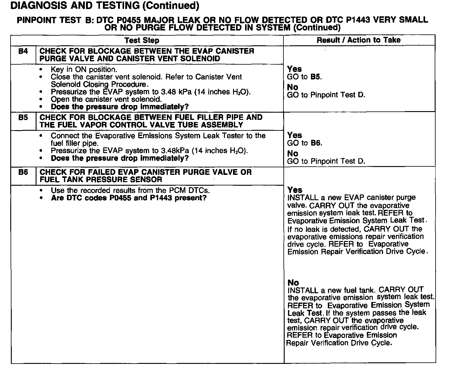 PINPOINT TEST B: DTC P0455 MAJOR LEAK OR NO FLOW DETECTED OR DTC P1443 VERY SMALL OR NO PURGE FLOW DETECTED IN SYSTEM