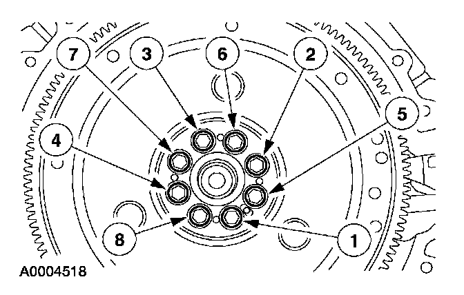 2. Install the flexplate bolts and tighten in two stages in the sequence shown.