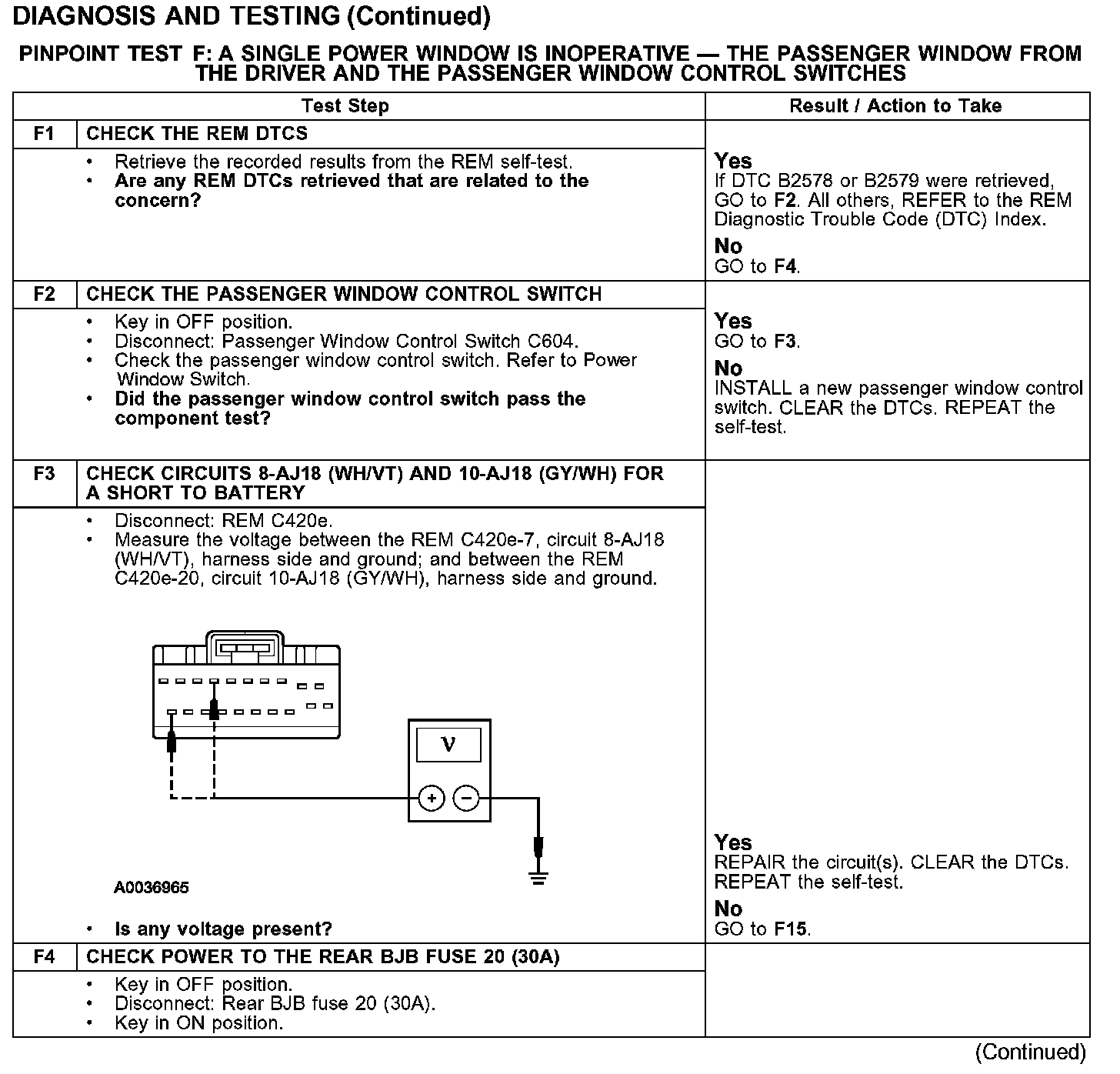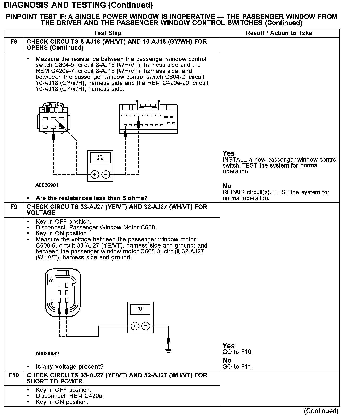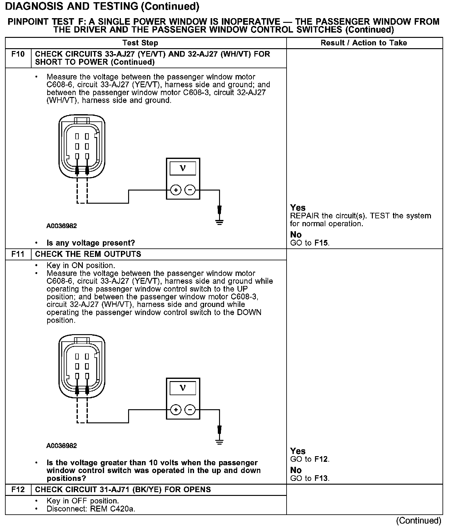 PINPOINT TEST F: A SINGLE POWER WINDOW IS INOPERATIVE - THE PASSENGER WINDOW FROM THE DRIVER AND THE PASSENGER WINDOW CONTROL SWITCHESTest F1-F4: