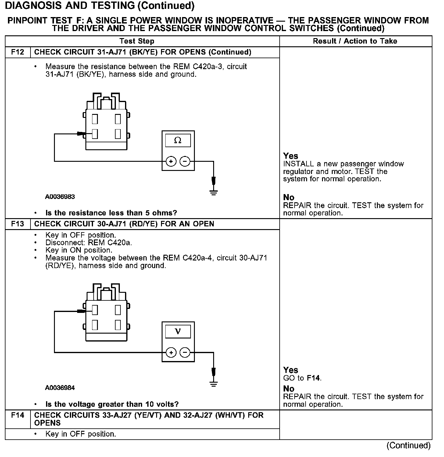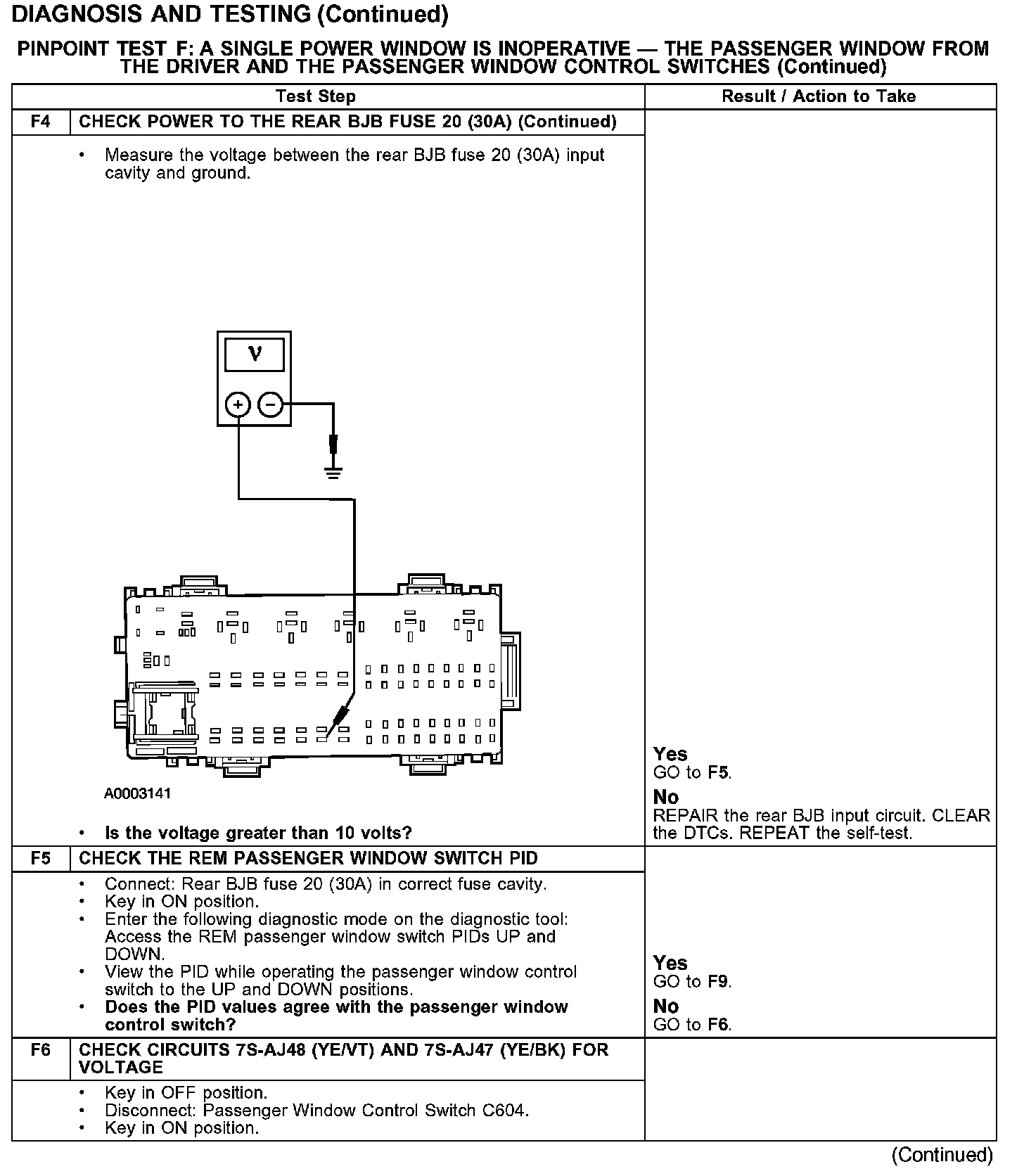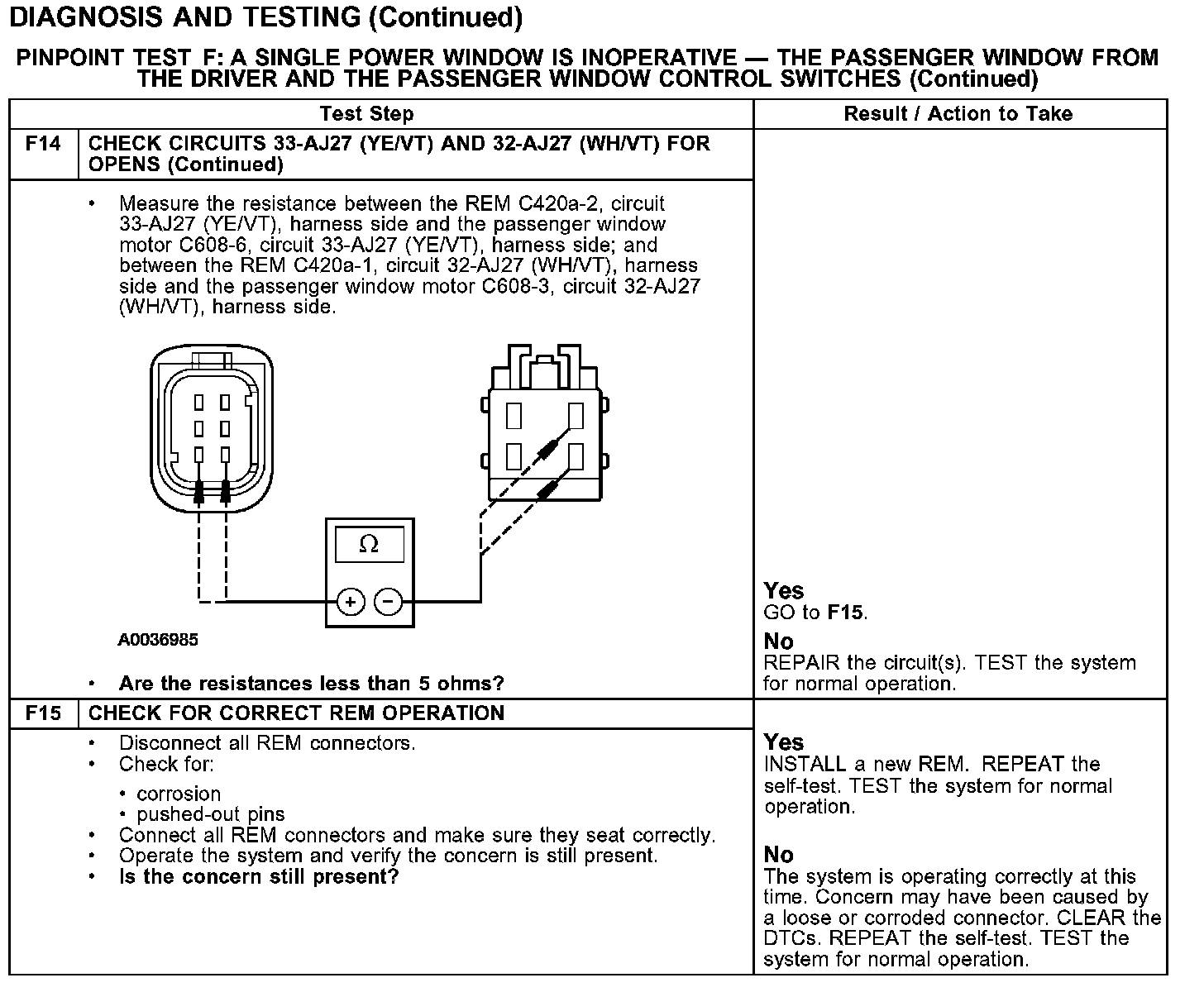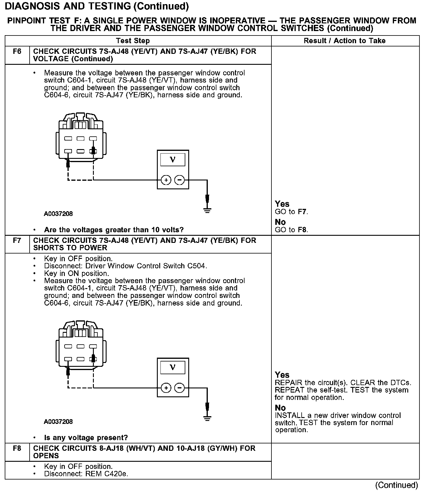PINPOINT TEST F: A SINGLE POWER WINDOW IS INOPERATIVE - THE PASSENGER WINDOW FROM THE DRIVER AND THE PASSENGER WINDOW CONTROL SWITCHESTest F1-F4: