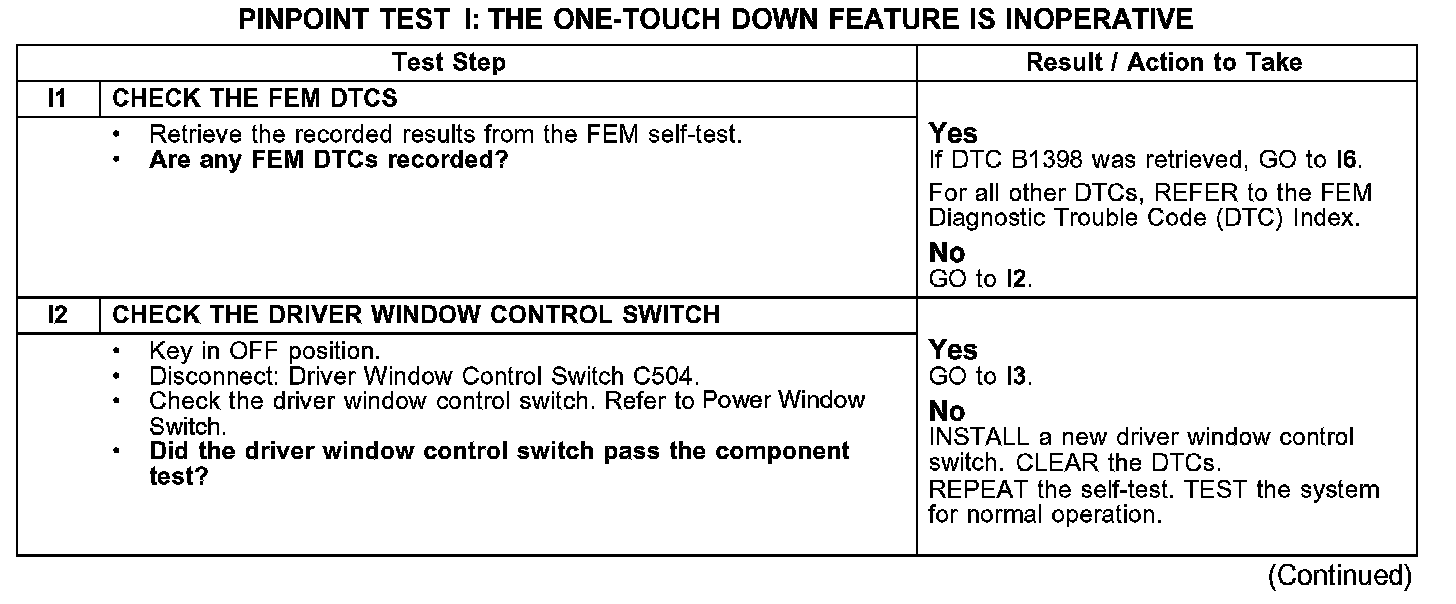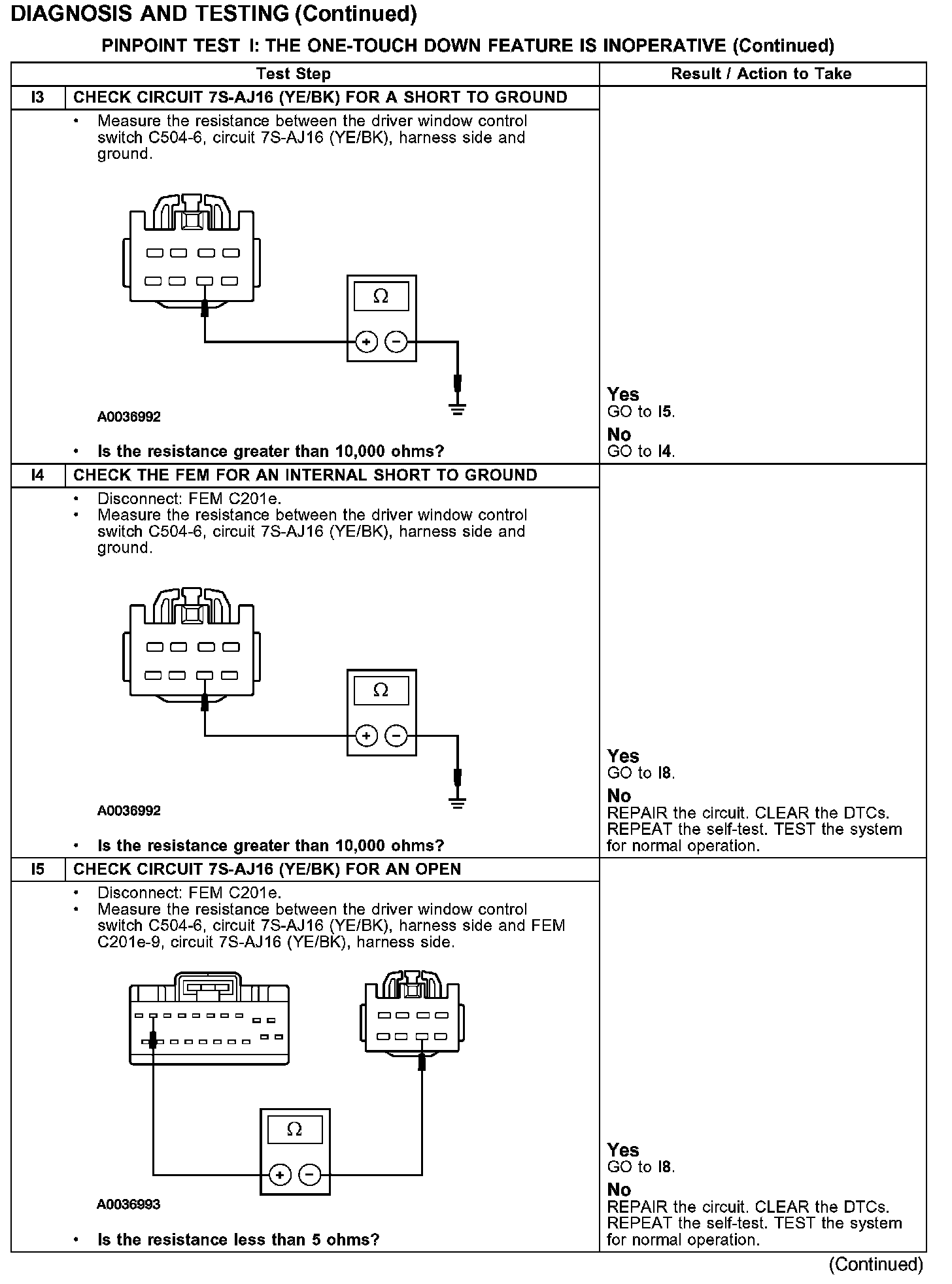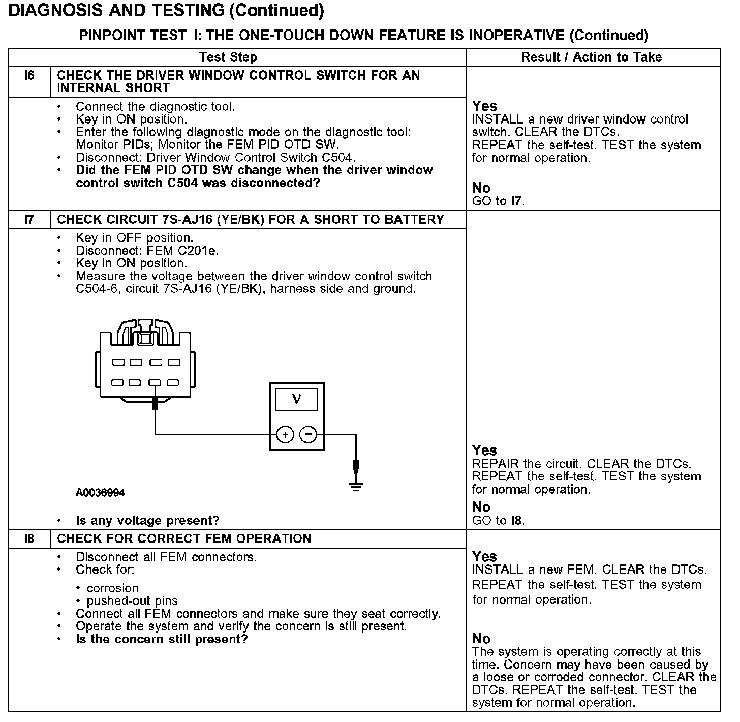 The FEM powers circuit 7S-AJ16 (YE/BK) to the driver window control switch. When the FEM detects a ground on circuit 7S-AJ16 (YE/BK), it powers and grounds the appropriate driver window motor circuits in order to accomplish the commanded one-touch down operation of the driver window.