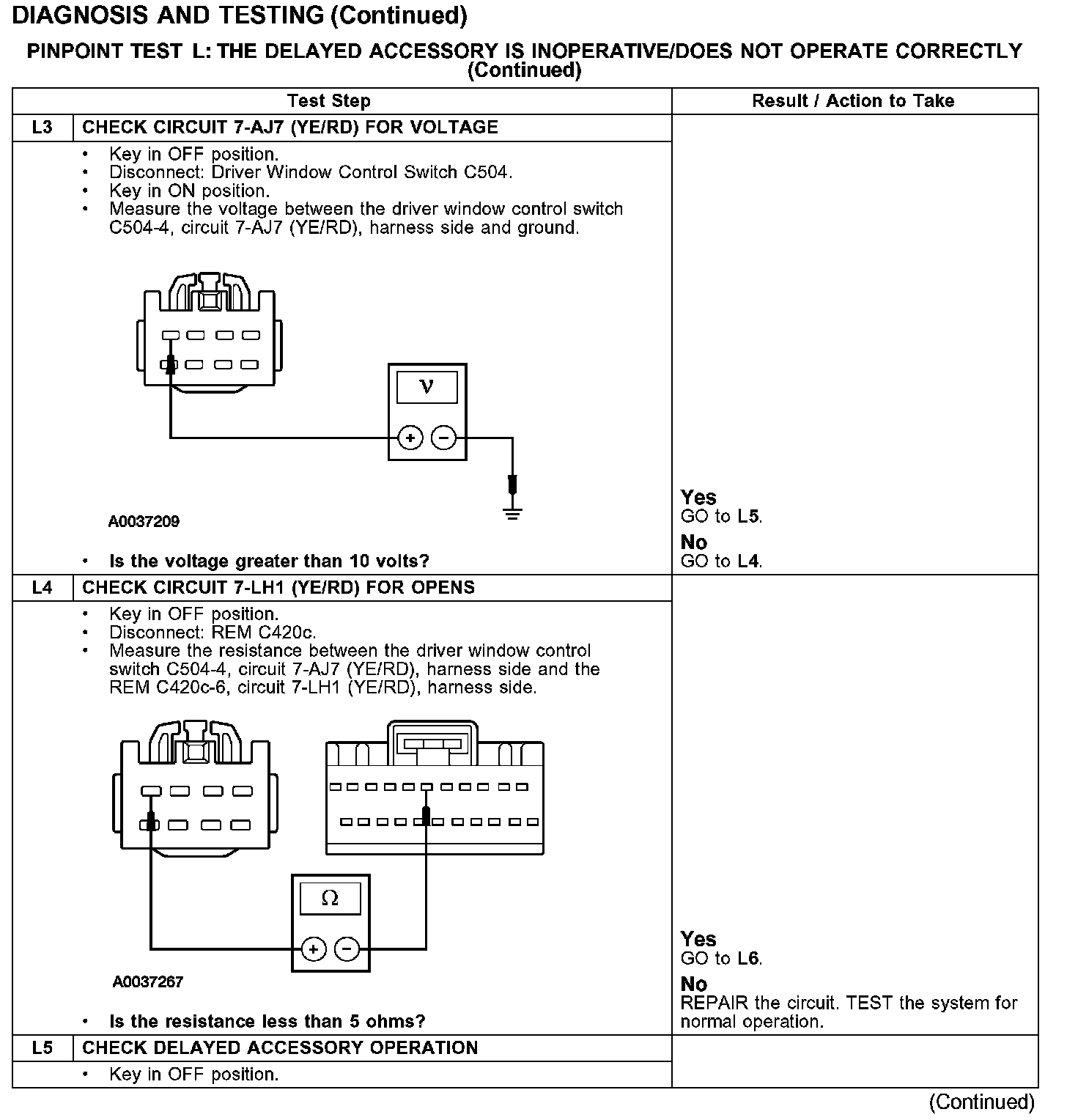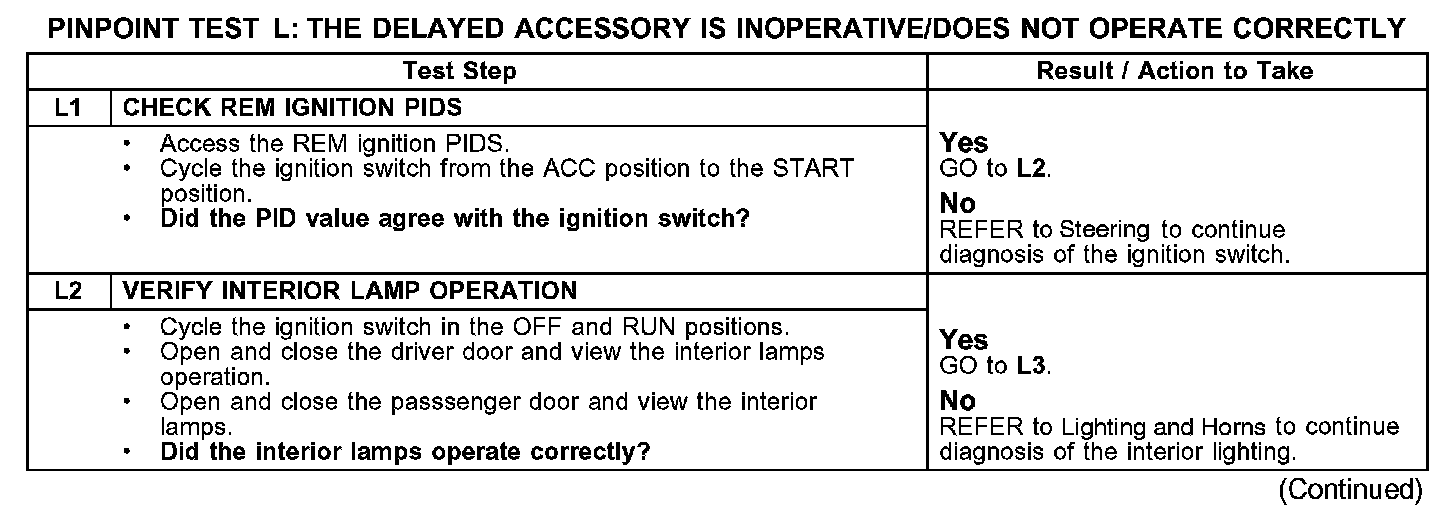 PINPOINT TEST L: THE DELAYED ACCESSORY IS INOPERATIVE/DOES NOT OPERATE CORRECTLYTest L1-L2: