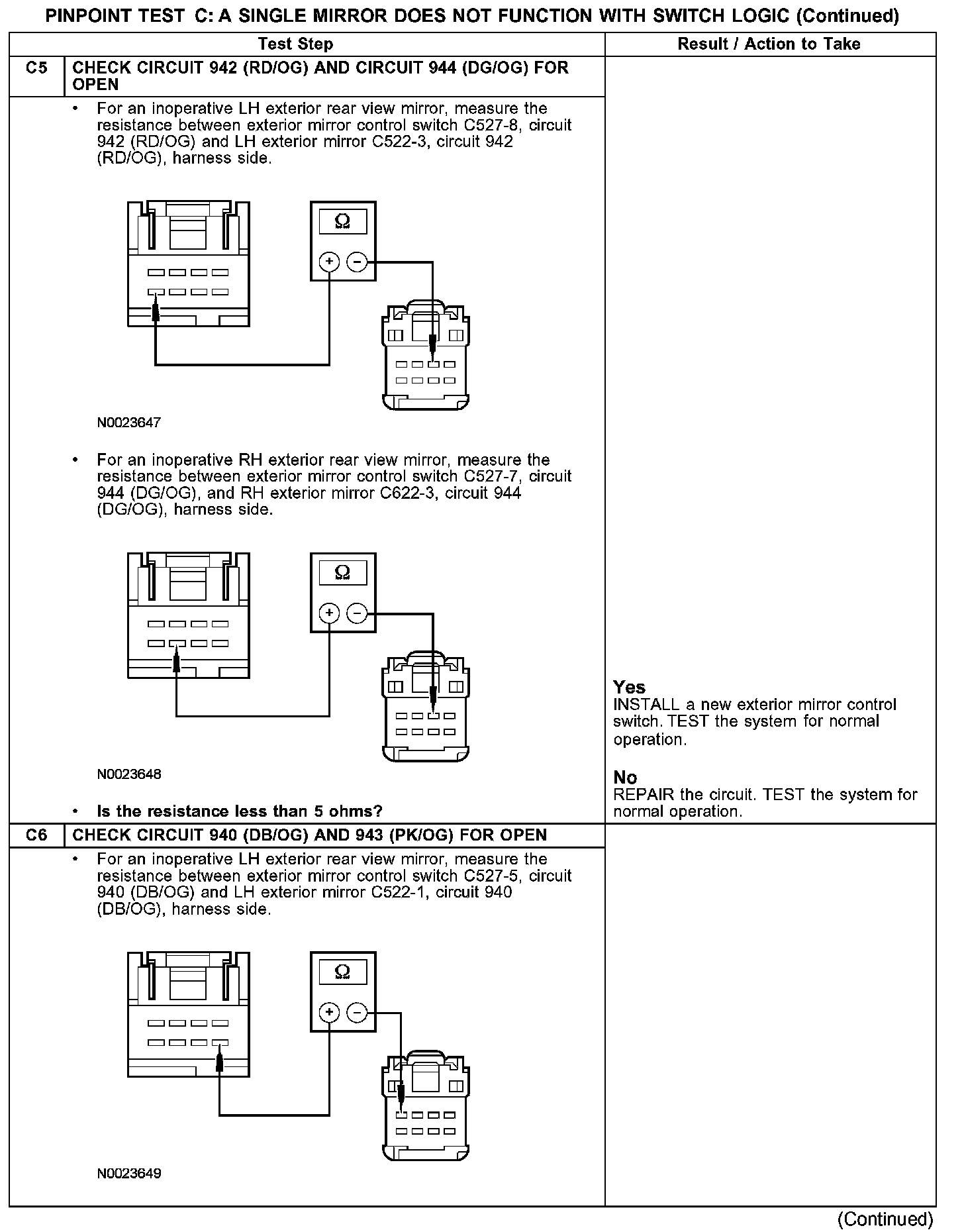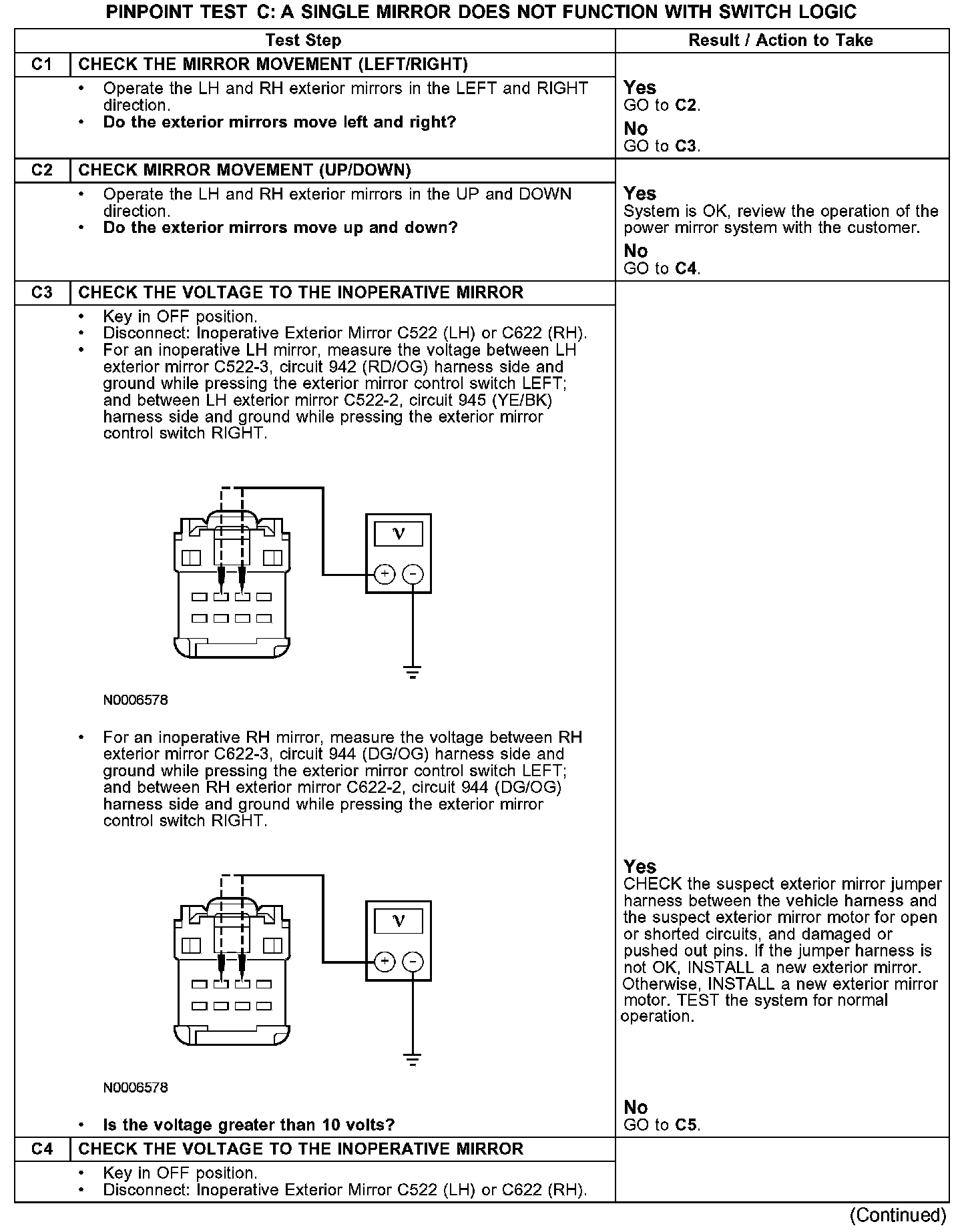 - When power is received through circuit 942 (RD/OG) or 944 (DG/OG) and ground through circuit 945 (YE/BK), the LH or RH exterior mirror glass will move RIGHT.