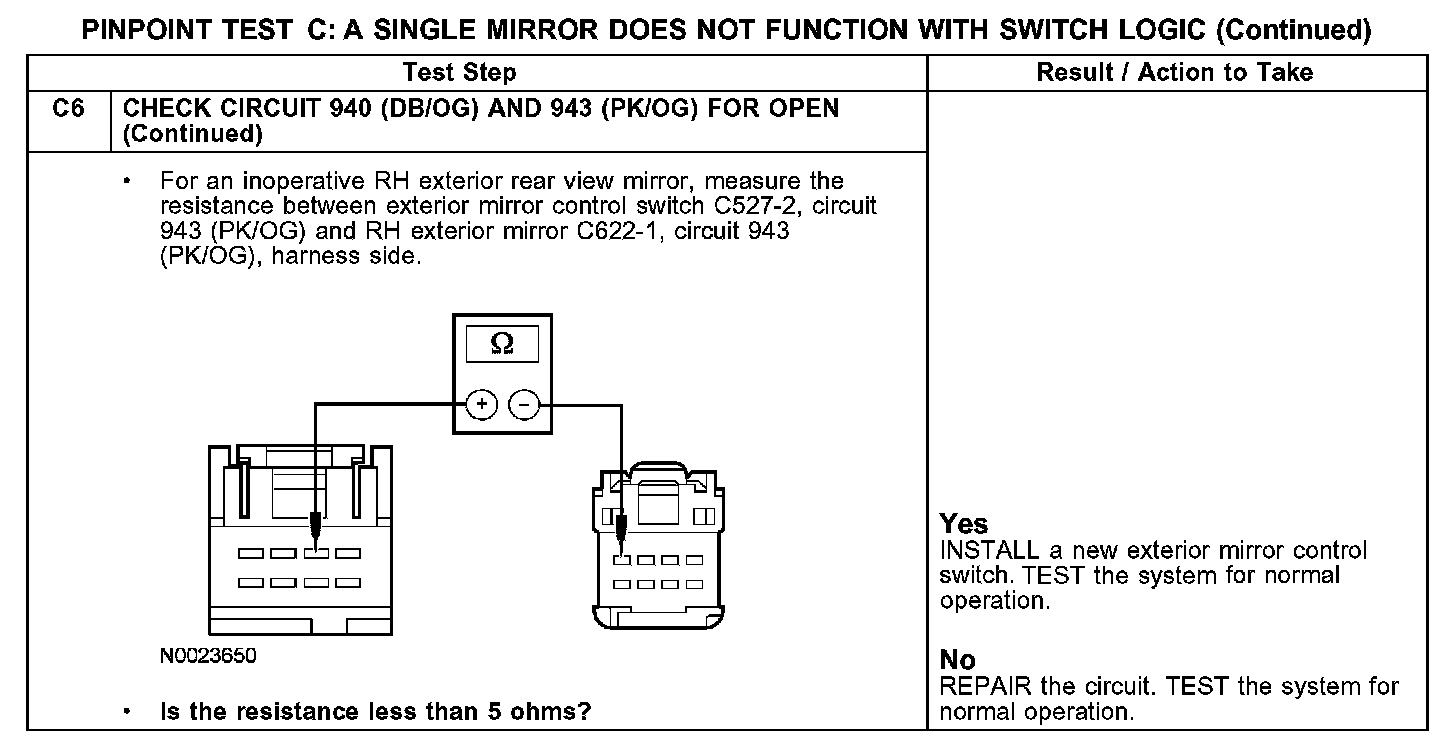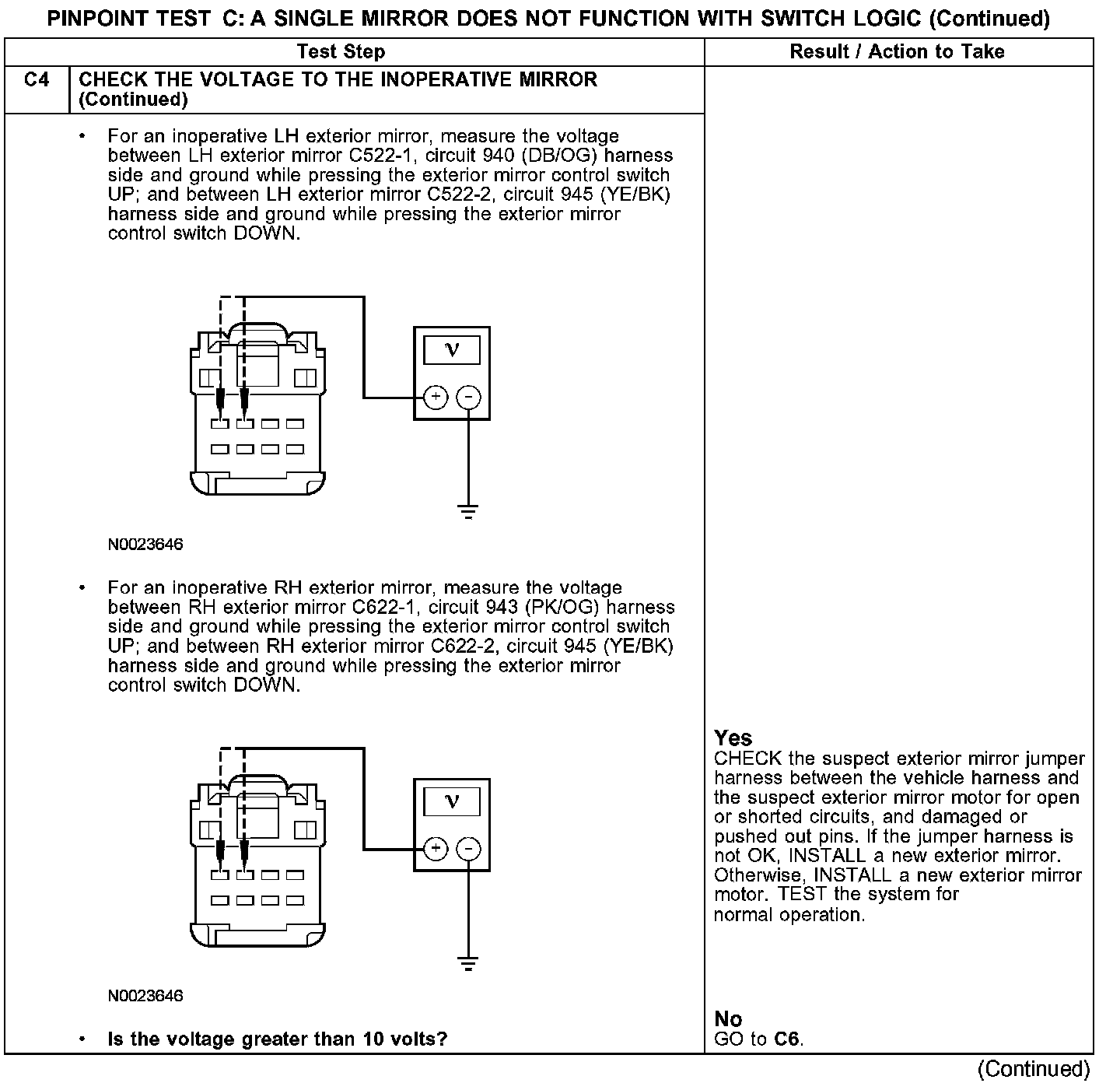 - When ground is received through circuit 940 (DB/OG) or 943 (PK/OG) and power through circuit 945 (YE/BK), the LH or RH exterior mirror will operate DOWN.