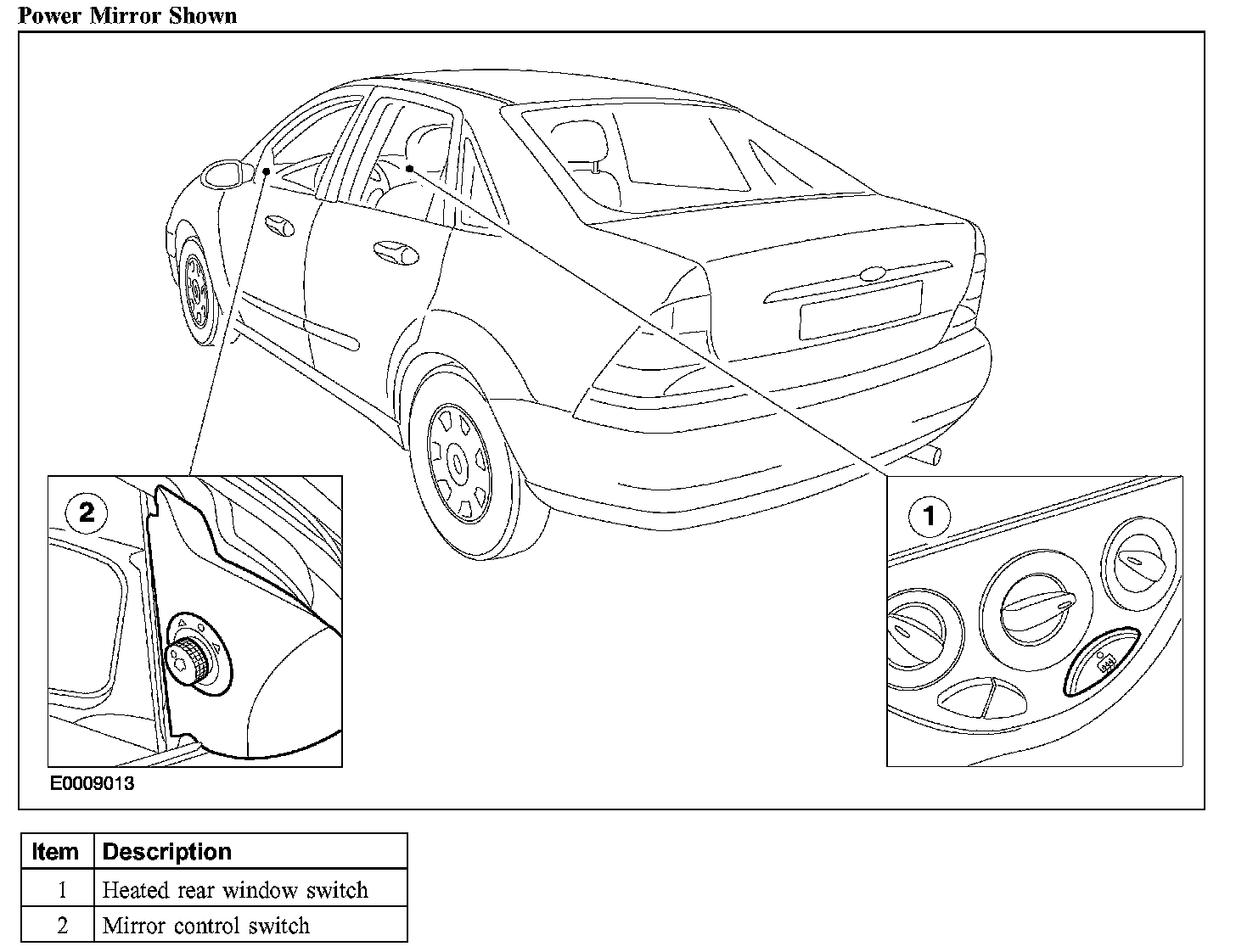 Exterior mirrors are either manual or power operated depending on the vehicle specification. All power exterior mirrors are controlled by the exterior mirror control switch mounted on the driver mirror interior trim panel. If equipped with heated mirrors, the exterior mirrors have a heater element contained in the mirror glass which operates for the same time as the heated rear window and is activated by the heated rear window switch.
